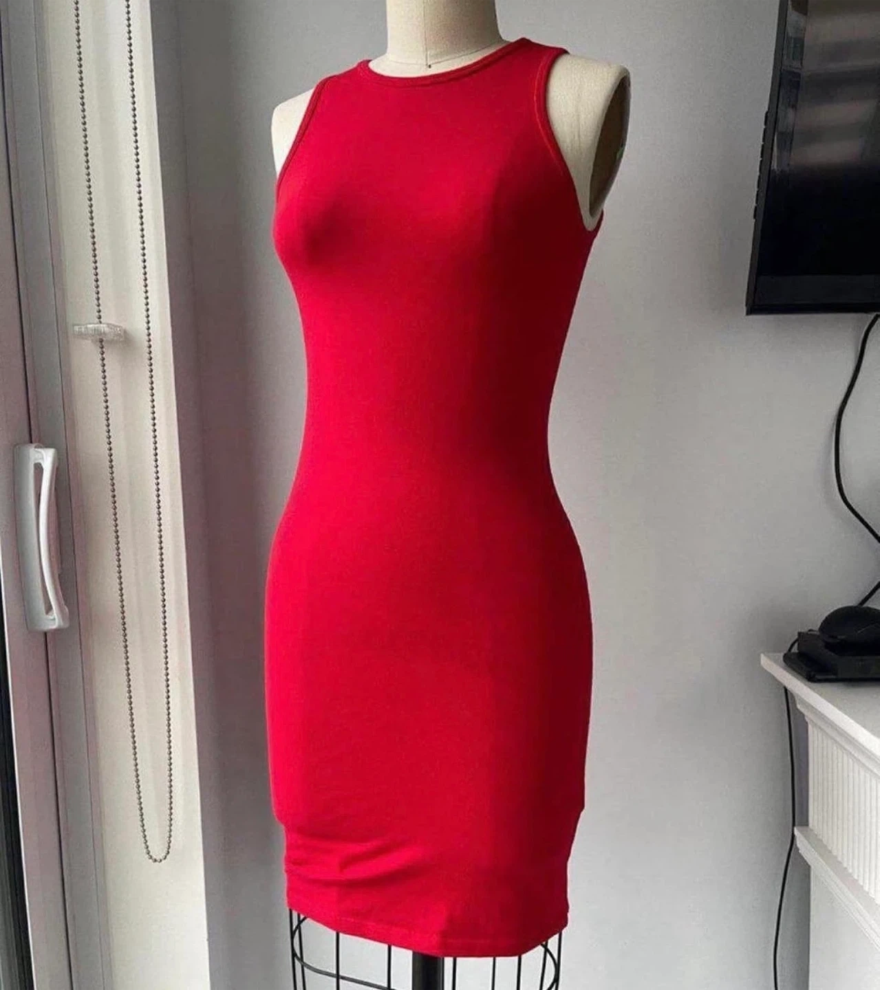 Here's a cute red sleeveless mini dress! It's in great condition and perfect for a night out or a casual day. The dress is a vibrant red colour and has a simple, flattering design.
