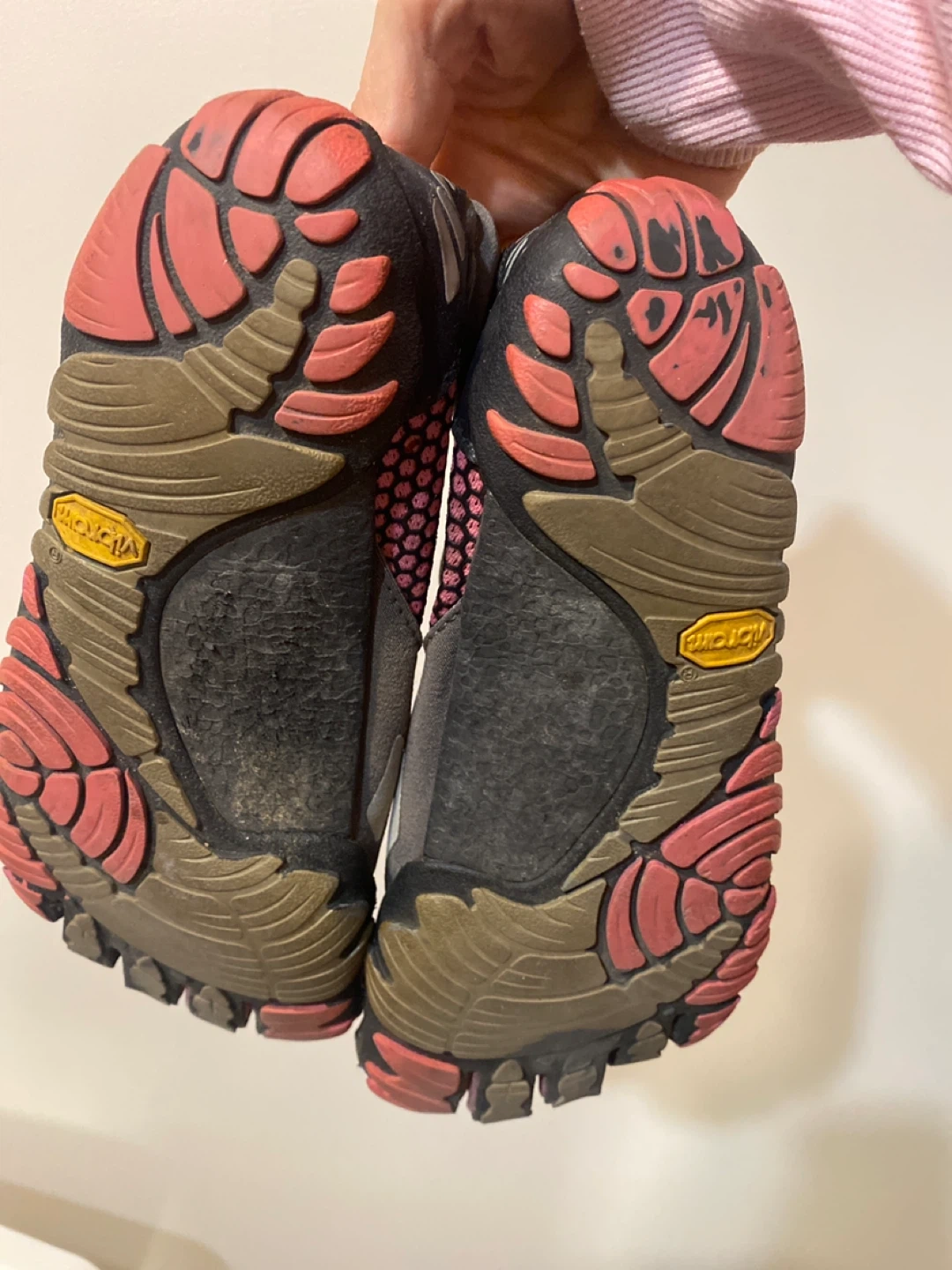 Selling a pair of Vibram FiveFingers women's shoes! They are size 38 and feature a unique toe design. These shoes are gray with pink accents and have a rubber sole for good grip. Great for running or training!