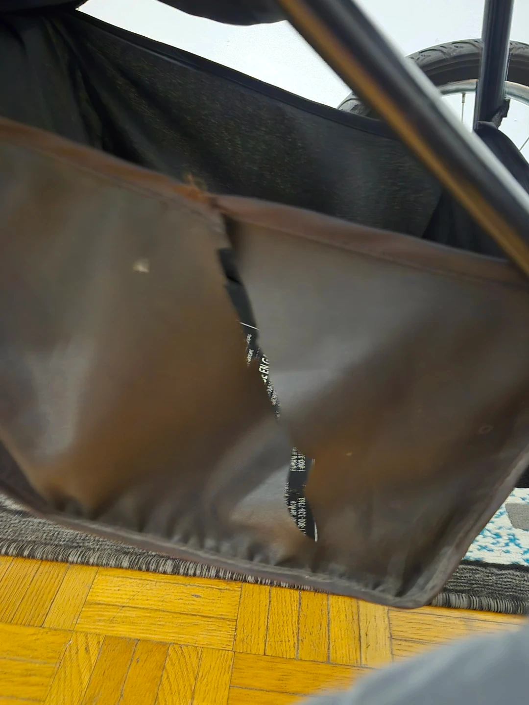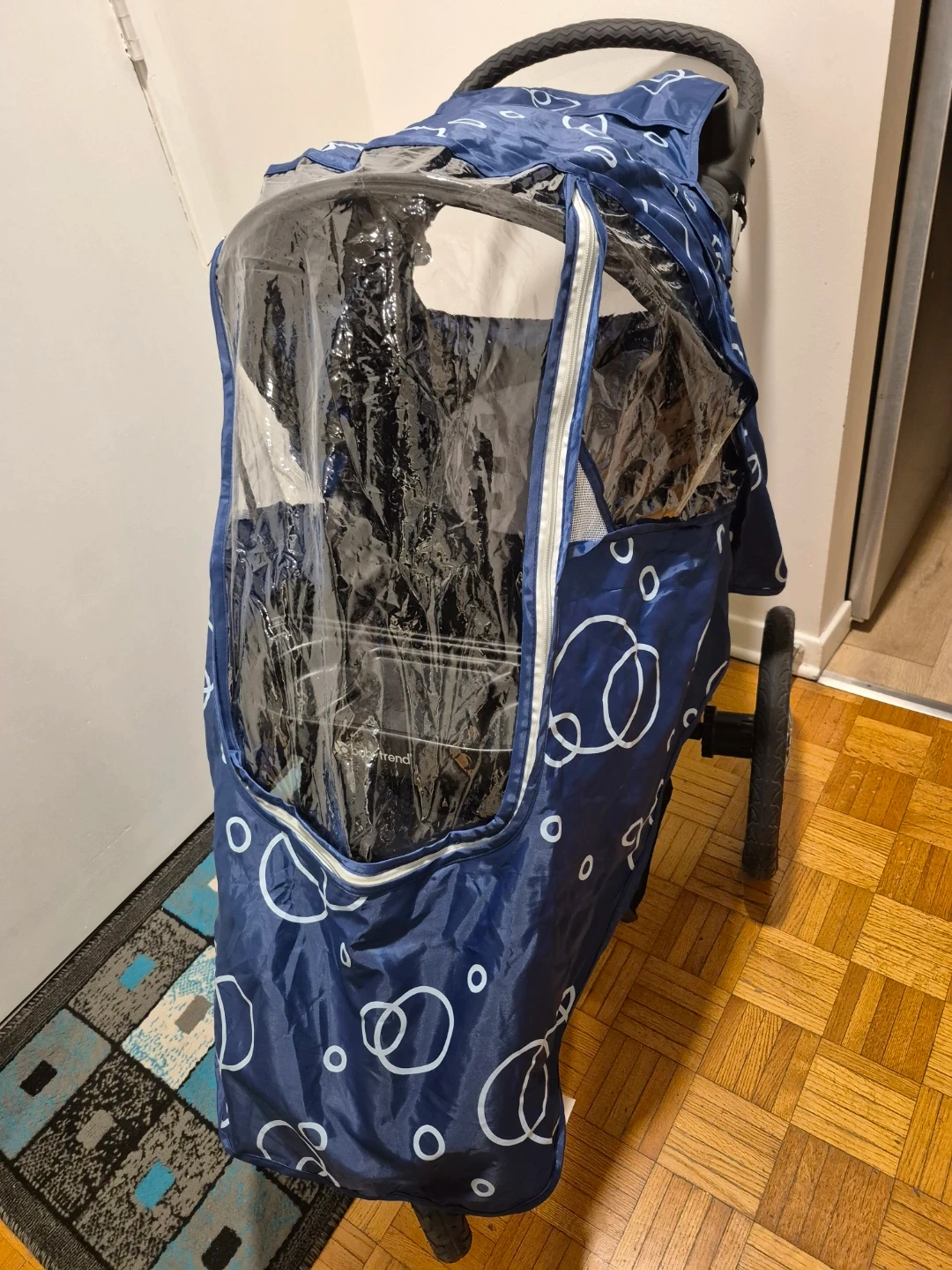 Baby Trend Expedition jogger stroller. It has a parent tray with two cup holders and a storage compartment. The child tray has two cup holders as well. There is a large storage basket underneath the seat (ripped on one side). The stroller also comes with a weather shield.