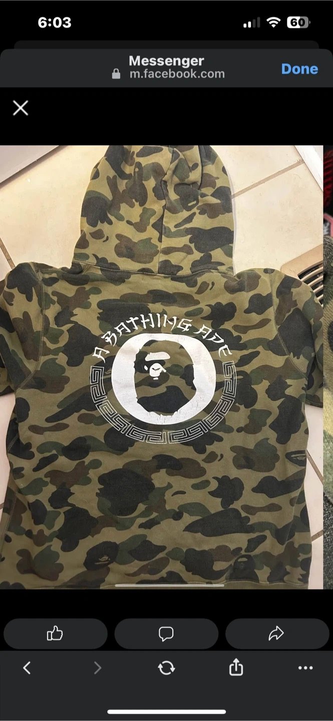 Selling an A Bathing Ape (BAPE) hoodie in a cool camo pattern. It's a size L and has the classic BAPE logo on the front and back. Perfect for adding a bit of streetwear style to your wardrobe!