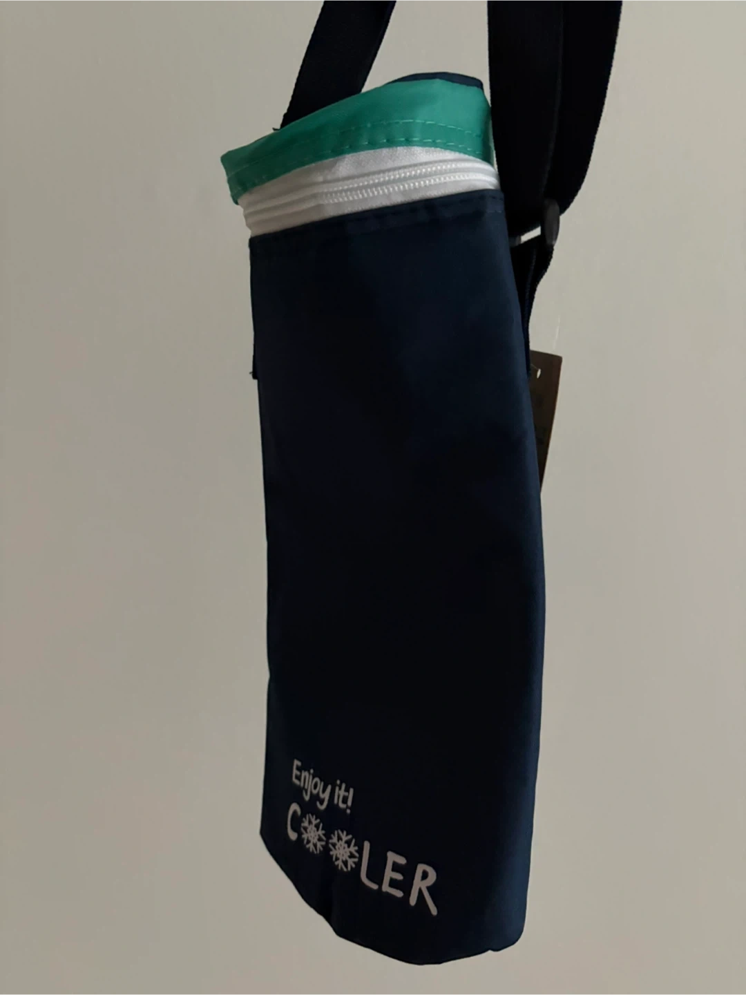 Keep your drinks cool on the go with this navy blue 'Enjoy It!' cooler bag! It features a convenient shoulder strap and a zippered top to keep everything secure and chilled. Perfect for picnics, hikes, or just keeping your beverage cold on a hot day