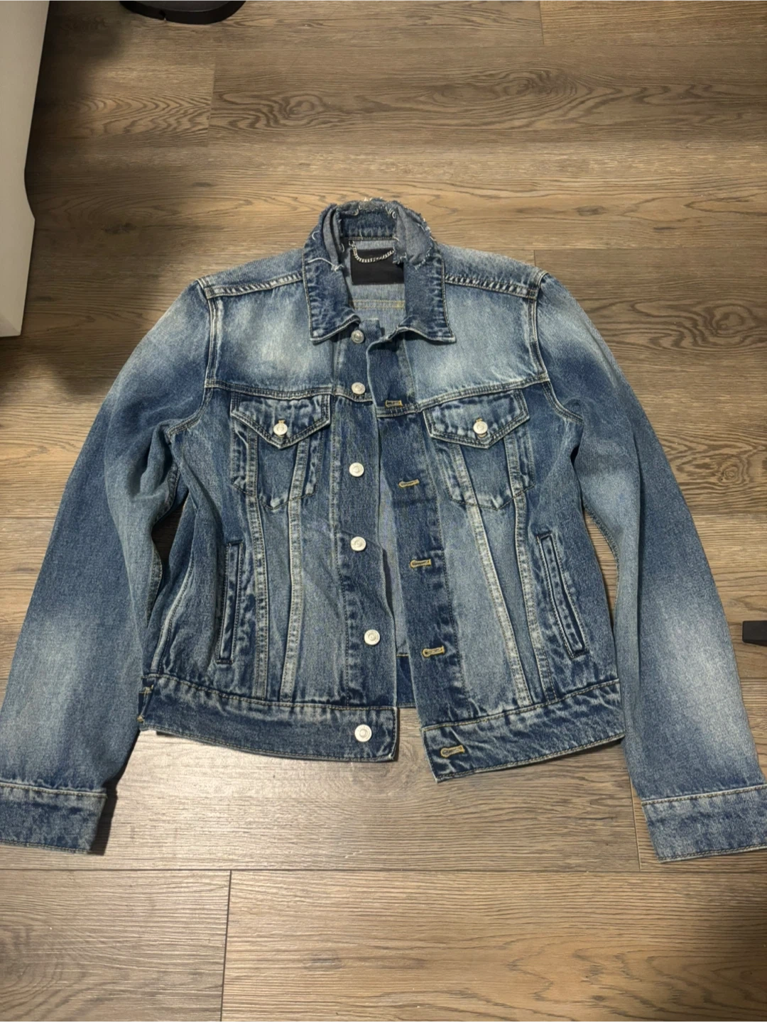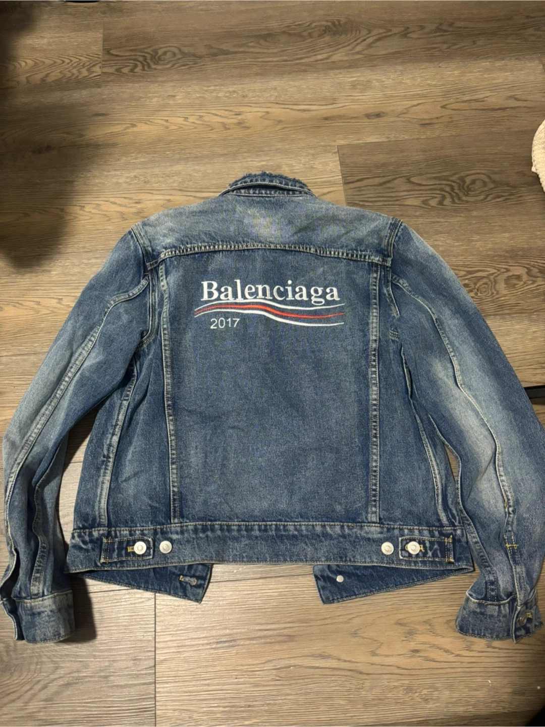 Selling a Balenciaga denim jacket in size 46. It's a stylish blue denim material. Feel free to reach out if you have any questions!