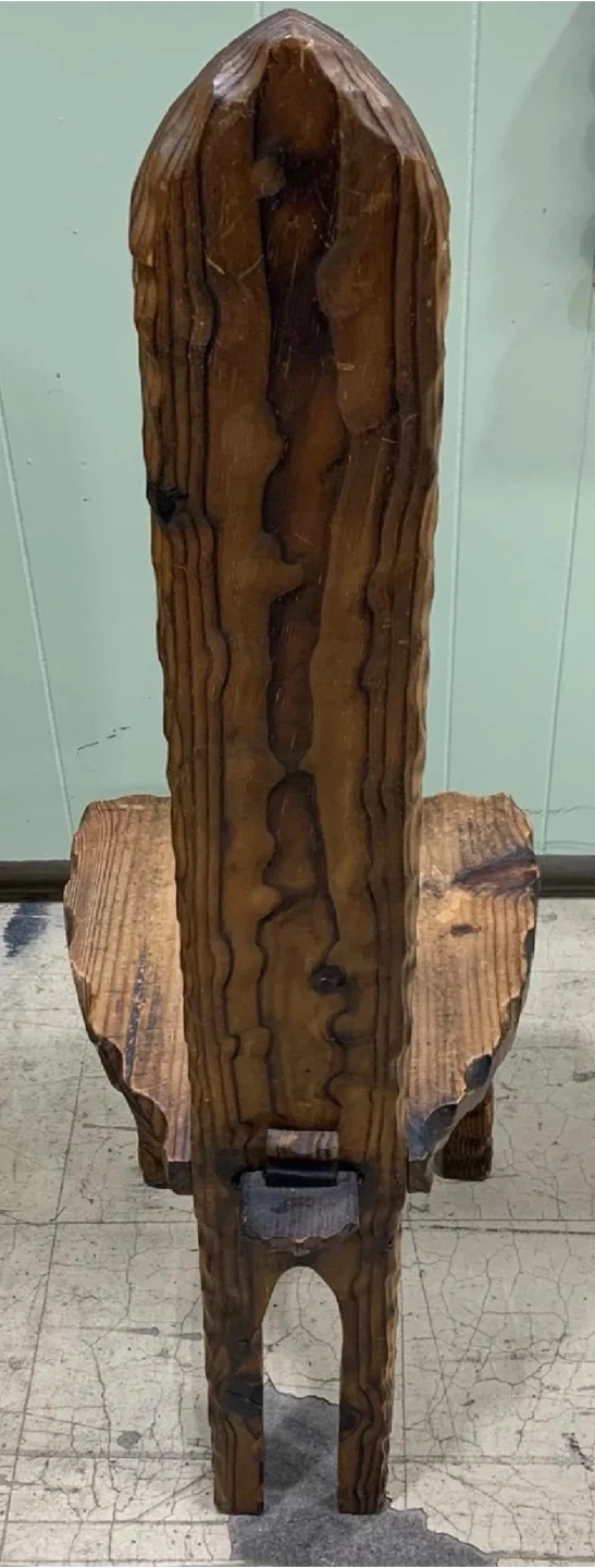 Unique hand-carved wooden chair, perfect as a decorative piece or for rustic seating. The chair features a distinctive design with a high back and textured legs. It shows some signs of wear, adding to its vintage charm
