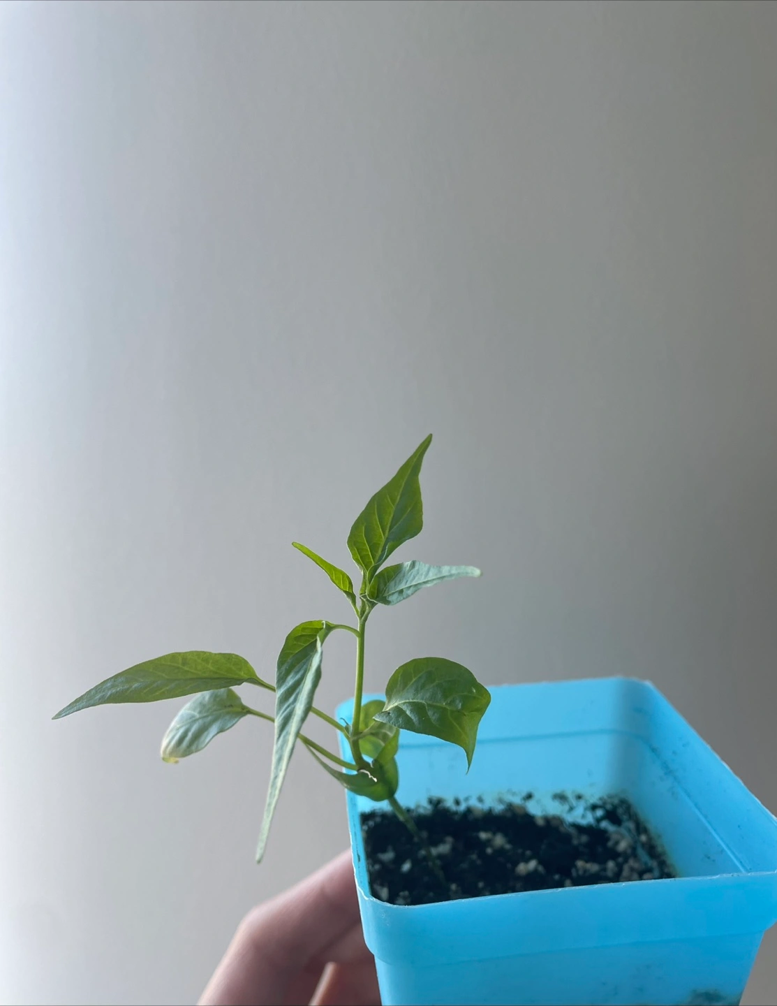 This is a young chilli pepper seedling. It's currently growing in a small blue pot and is showing healthy new growth. Perfect for starting your own pepper plants this season!