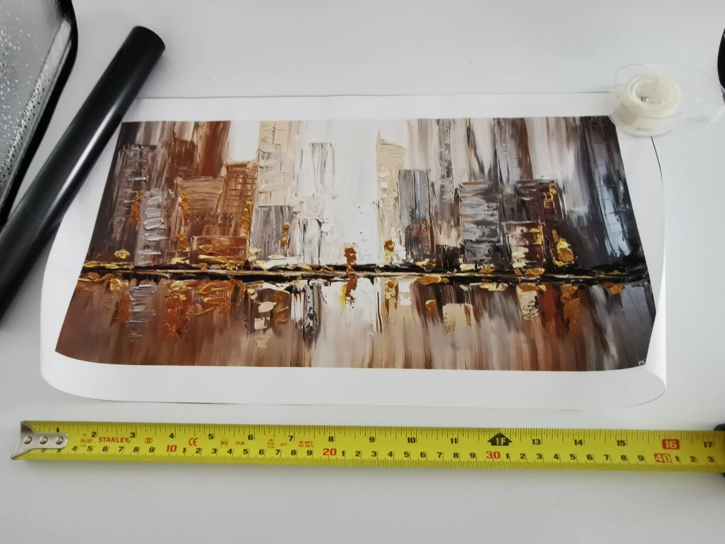 Here's a lovely cityscape print in shades of brown, white, and gold. It would make a great addition to any room! The print measures approximately 16" x 10"