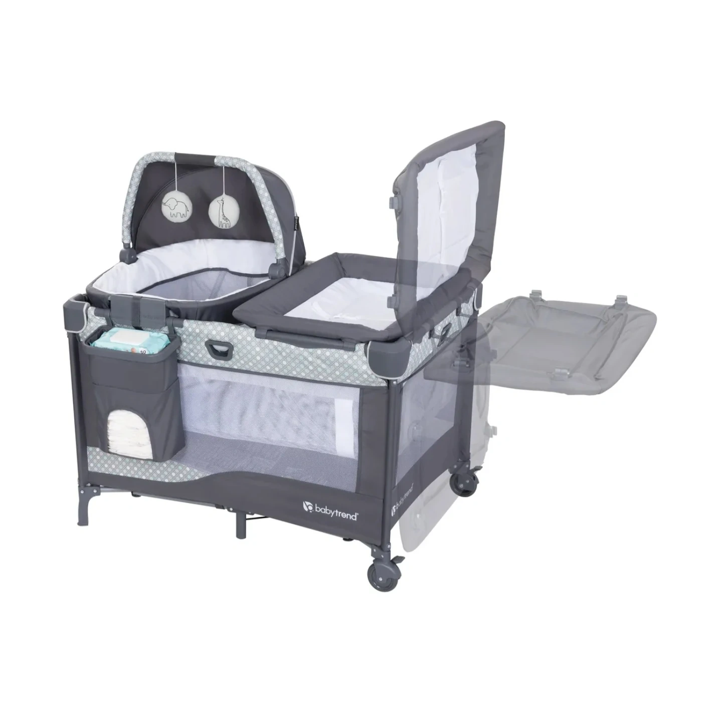 Selling a Baby Trend playard that comes with a rocking bassinet! It's in great condition and ready for a new little one. The playard features a changing table and a storage compartment for diapers and wipes. The rocking bassinet is perfect for soothing your baby to sleep.