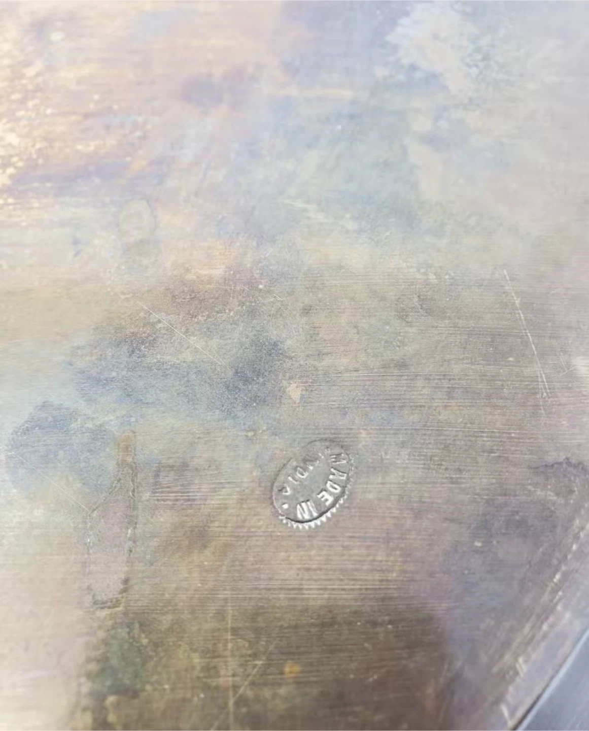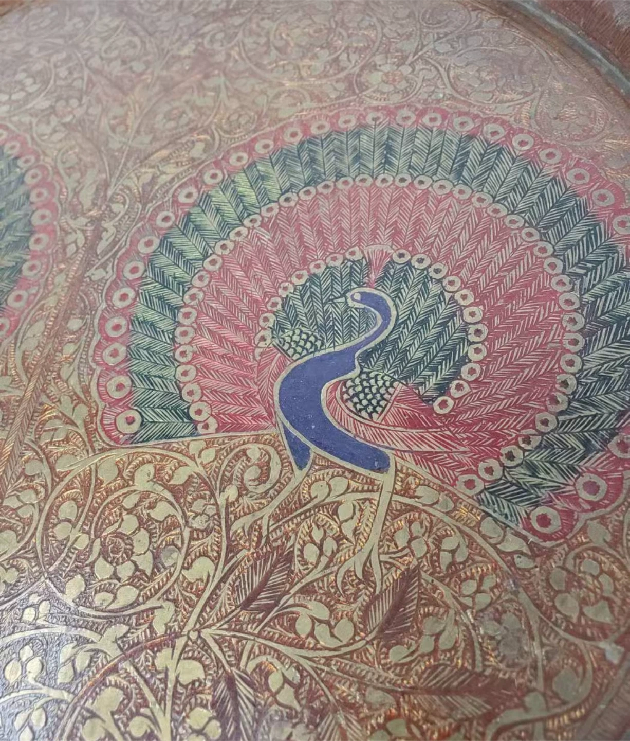 Selling a vintage etched brass tray, marked 'Made in India'. It features a beautiful peacock design. It measures approximately 30cm in diameter. It would be a lovely decorative piece for your home!