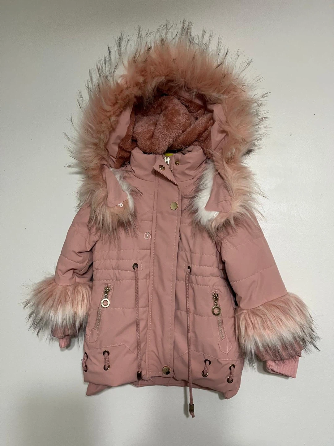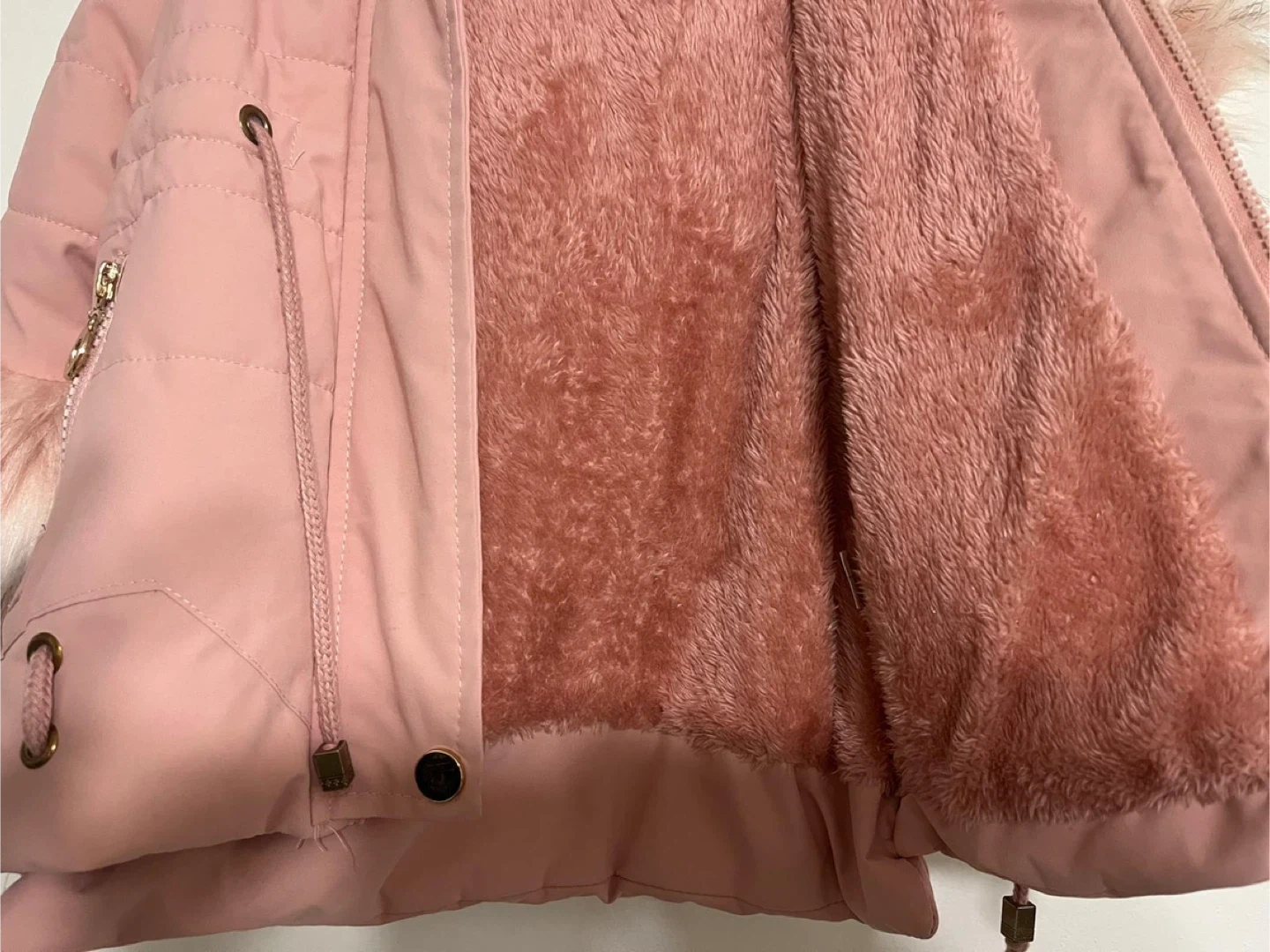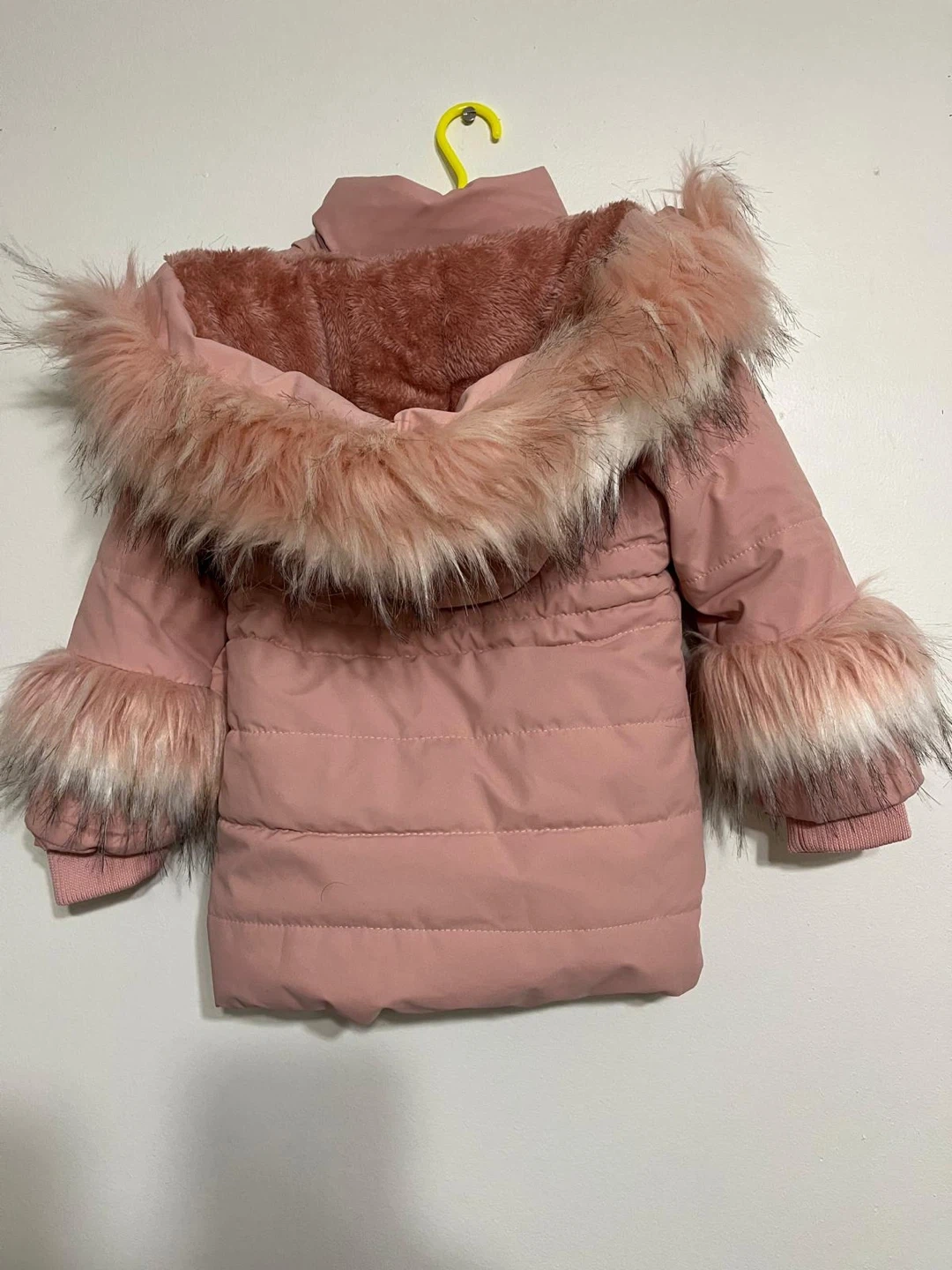 A super cute pink winter coat for girls! It has a furry hood and furry trim on the sleeves to keep your little one warm and stylish during the colder months. The inside is lined with a soft, plush material for extra comfort. Perfect for outdoor play or a trip to the store!