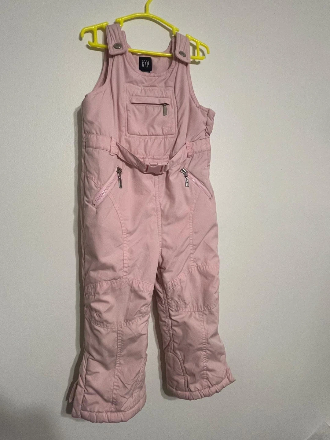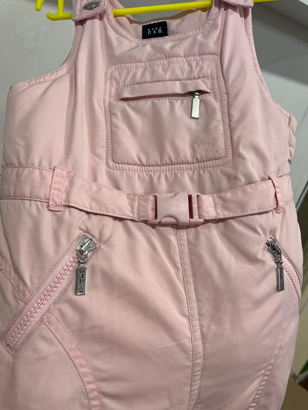 Selling a cute baby Gap snowsuit in pink! It has a front pocket and a belt. Perfect for keeping your little one warm and cozy during the winter months