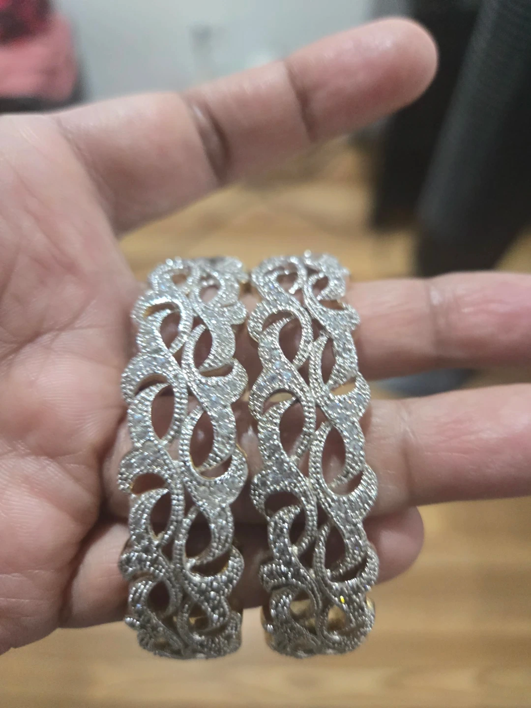 Selling a set of two silver-colored bangles. They have a beautiful, intricate design. Perfect for adding a touch of sparkle to any outfit!