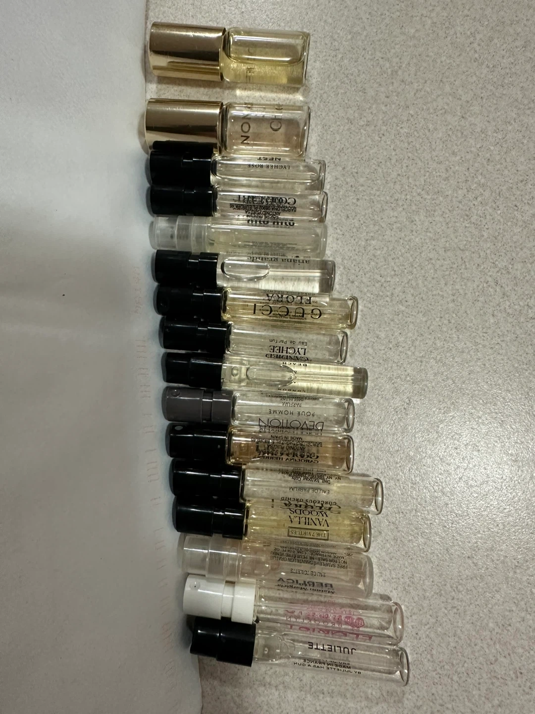 Selling a collection of perfume samples from various designer brands. Includes fragrances from Gucci, Jo Malone, Ariana Grande, Miu Miu, and more! Perfect for trying out new scents before committing to a full bottle, some tested for scent, 16 of them, will add more for free when find more.
