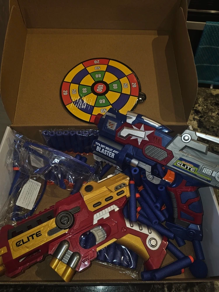 Selling a Blaster Shots electric soft bullet gun set for ages 6+. It comes with two blasters and lots of bullets. Also included is the target.