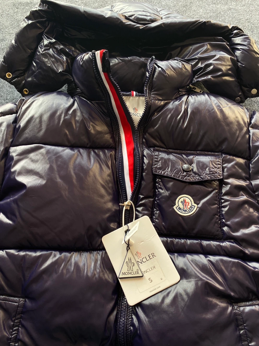Selling a Moncler black puffer jacket! It's in great condition and ready to keep you warm. The jacket features a stylish design with a glossy finish and a distinctive red and white stripe detail. Perfect for staying cozy during the colder months!