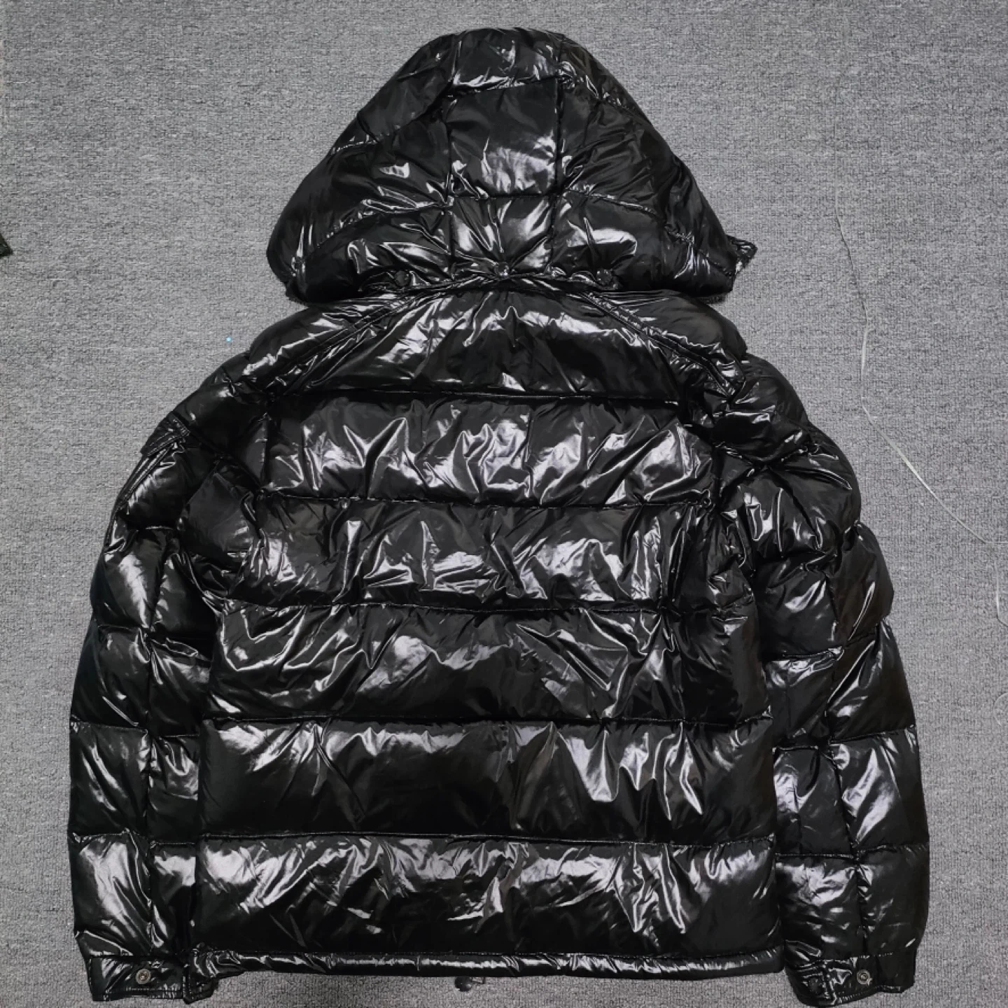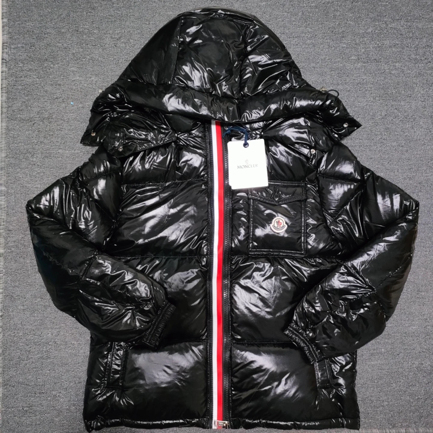 Selling a Moncler black puffer jacket! It's in great condition and ready to keep you warm. The jacket features a stylish design with a glossy finish and a distinctive red and white stripe detail. Perfect for staying cozy during the colder months!