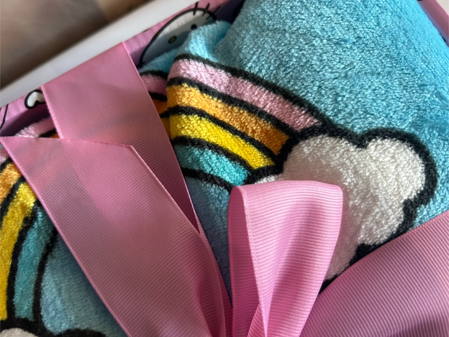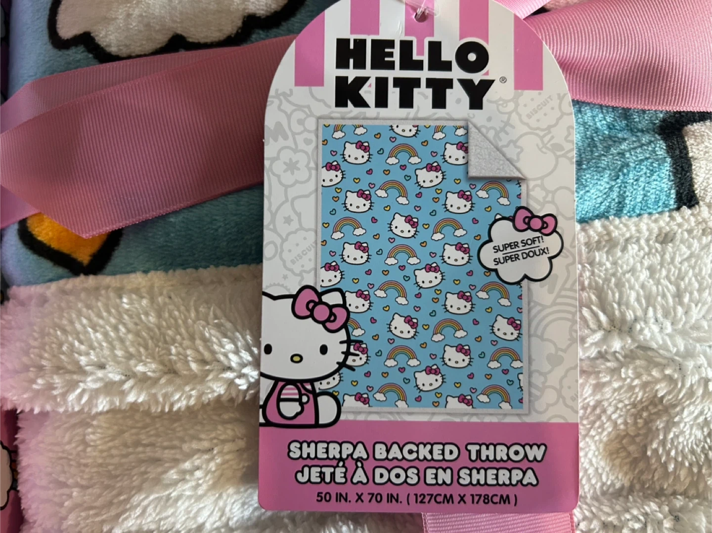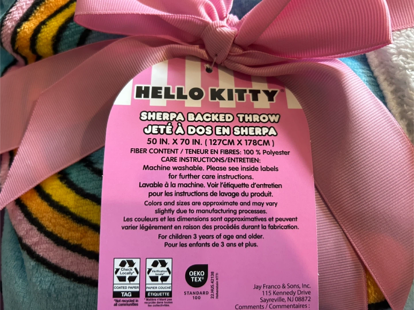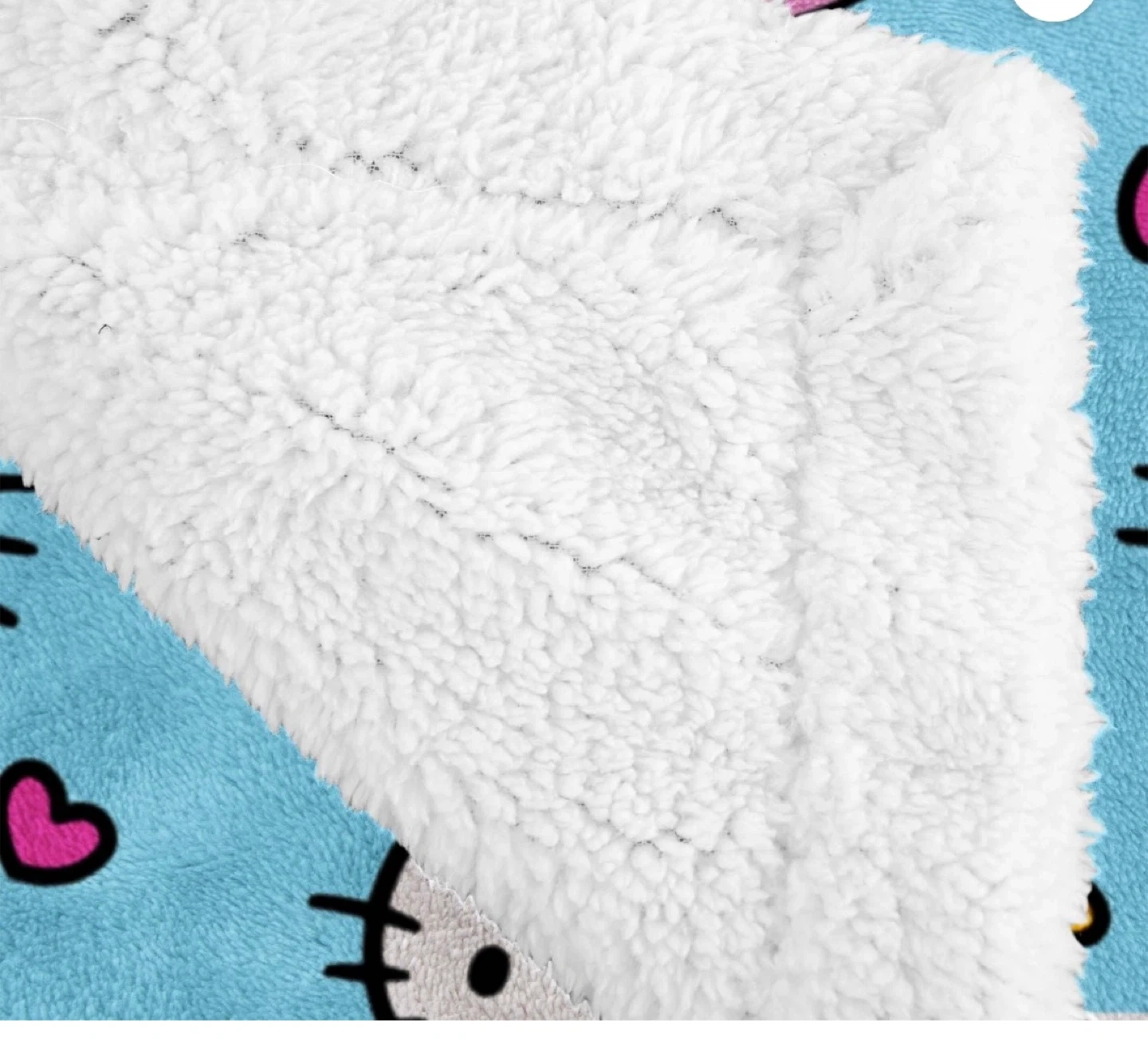 Brand new Hello Kitty Sherpa Backed Throw in its original box! It's super soft and measures 50 inches by 70 inches (127cm x 178cm). The throw is made of 100% polyester and features a cute Hello Kitty design.