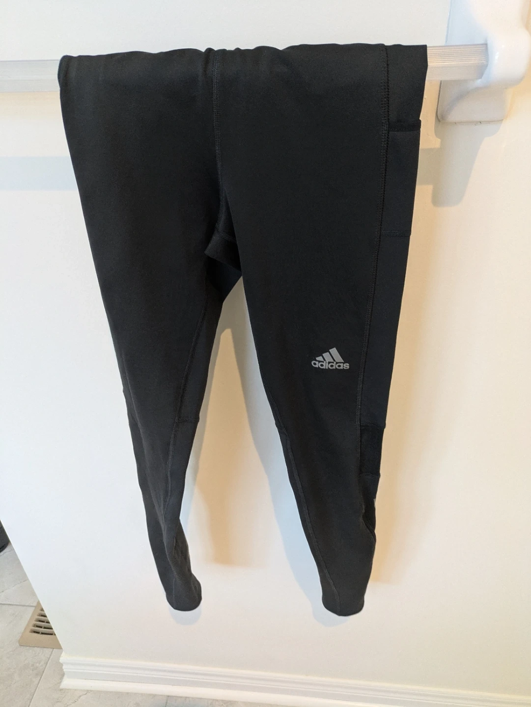 Selling a pair of Adidas men's running tights in black. These are perfect for running or working out. They feature the Adidas logo and reflective stripes. Great for any athletic activity!