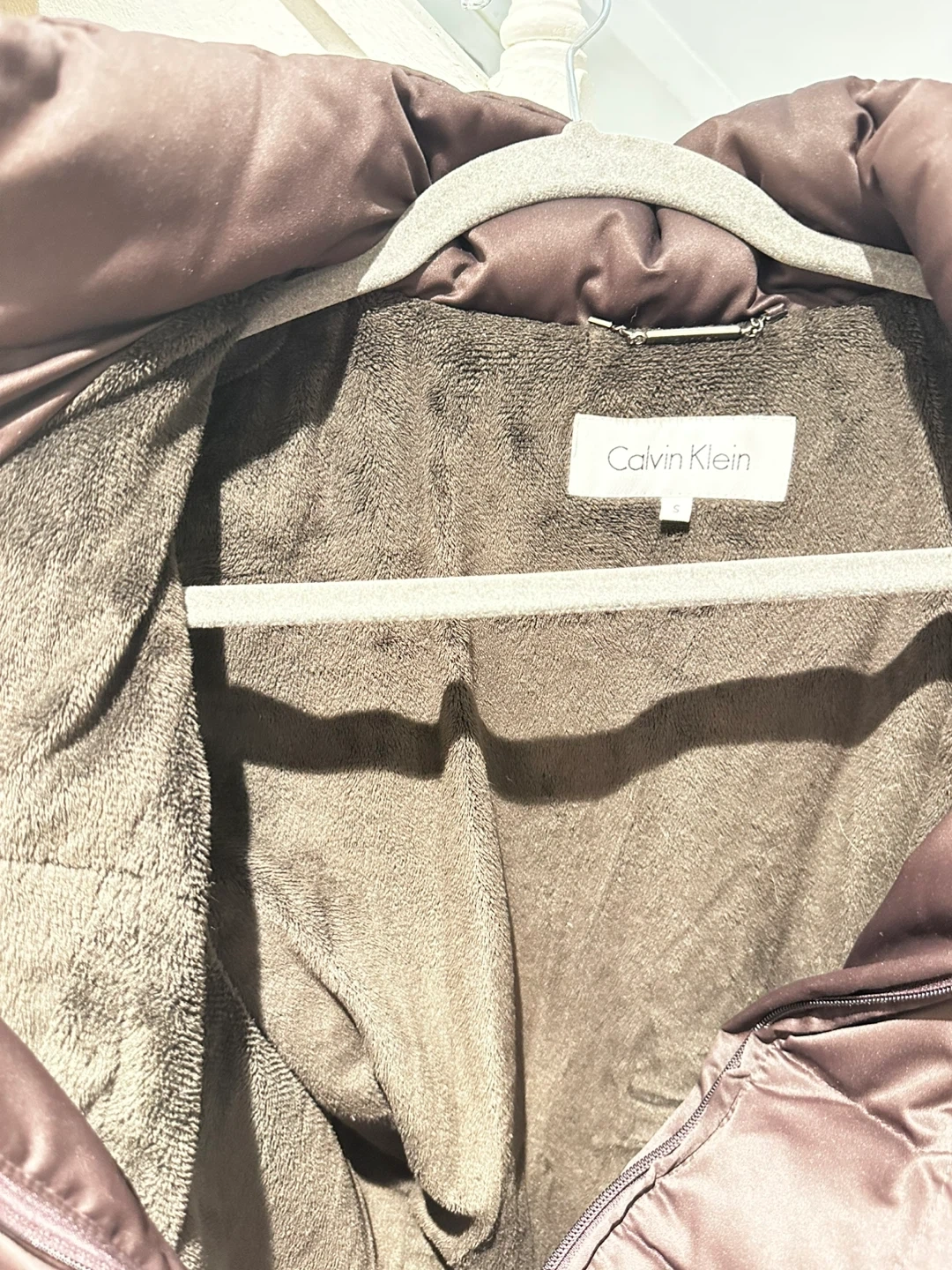 Selling a Calvin Klein puffer jacket in a dark brown colour. The jacket is lined with soft plush to keep you warm, perfect for Canada’s winter. It's in great condition.