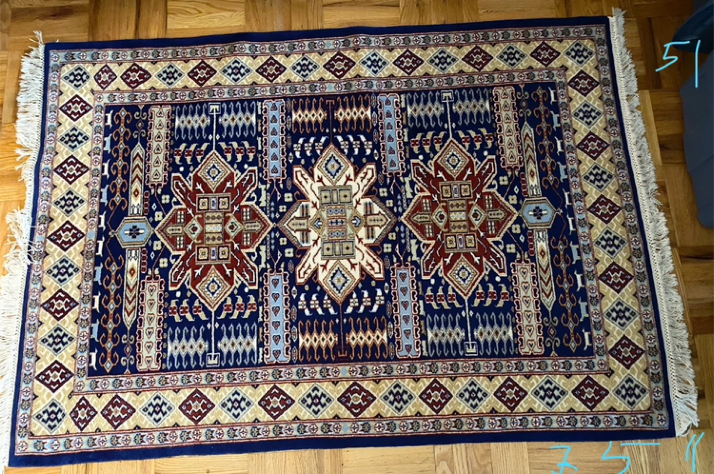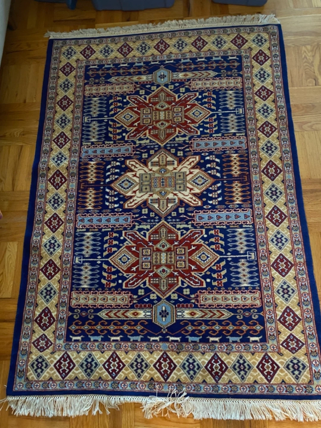 Beautiful Tibetan area rug with a unique pattern in blue, red, and beige. It is a wool rug that would look great in any room!