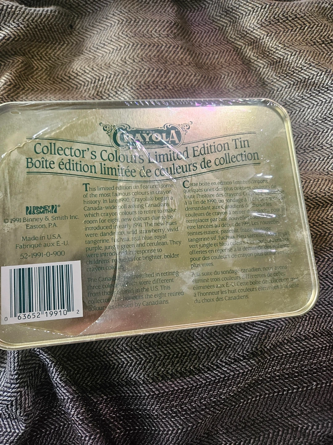 Selling a brand new Crayola Collector's Colors Limited Edition tin! This Canadian edition includes 72 crayons, including 8 retired colours. It comes in a special collector's box. A great item for collectors!