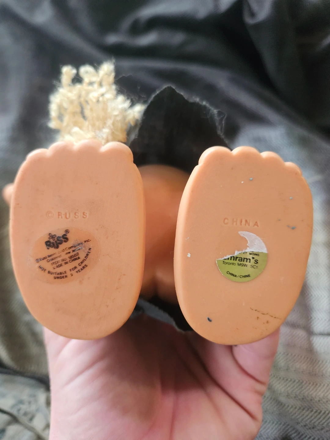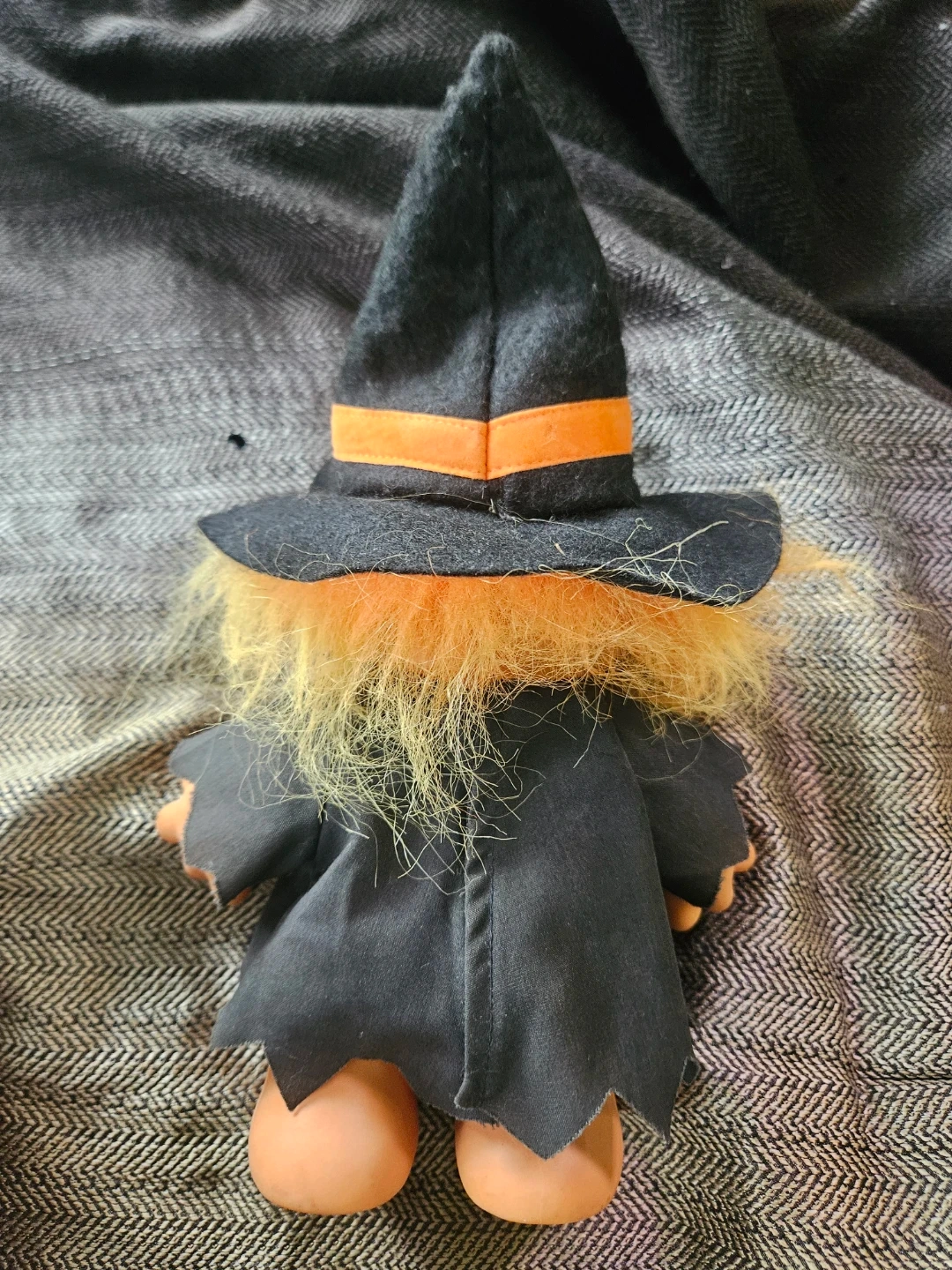 Here's a cute vintage, Russ troll doll dressed as a witch! It's in great shape and ready for a new home. It has a black hat and dress with colourful patches, and it's holding a broom. Perfect for Halloween or any time of year for a troll collector