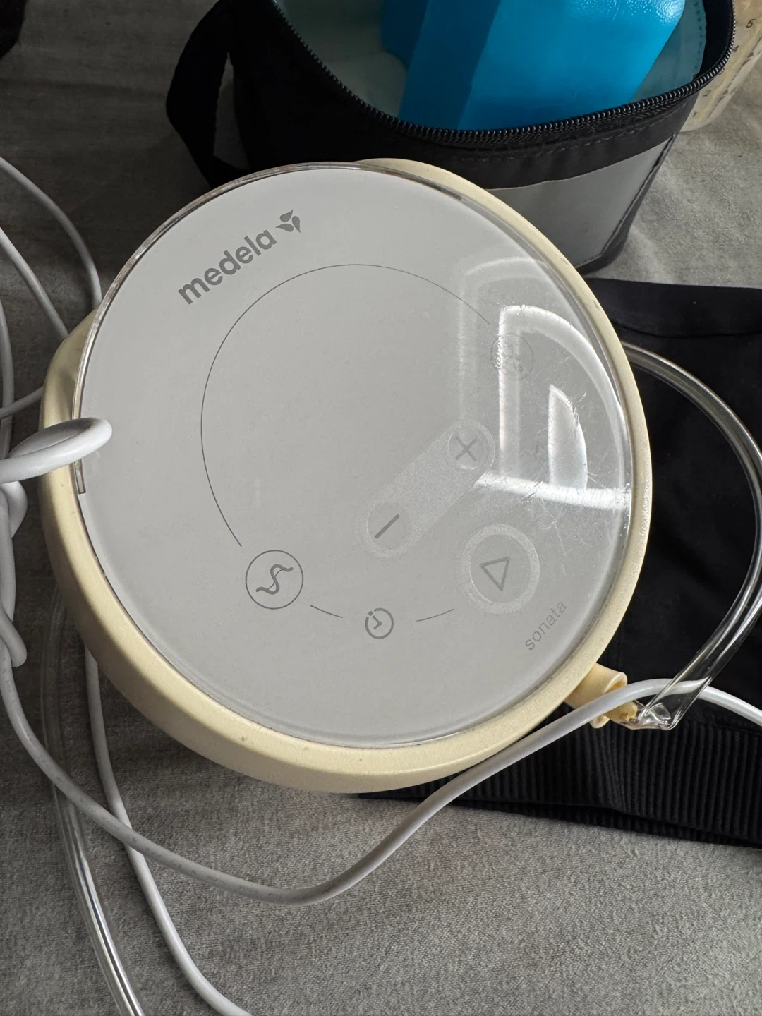 Selling a used Medela Sonata breast pump. It comes with all the pictured components, including the cooler bag, bottles, breast shields, and power adapter. It's in good condition and ready for a new mom!