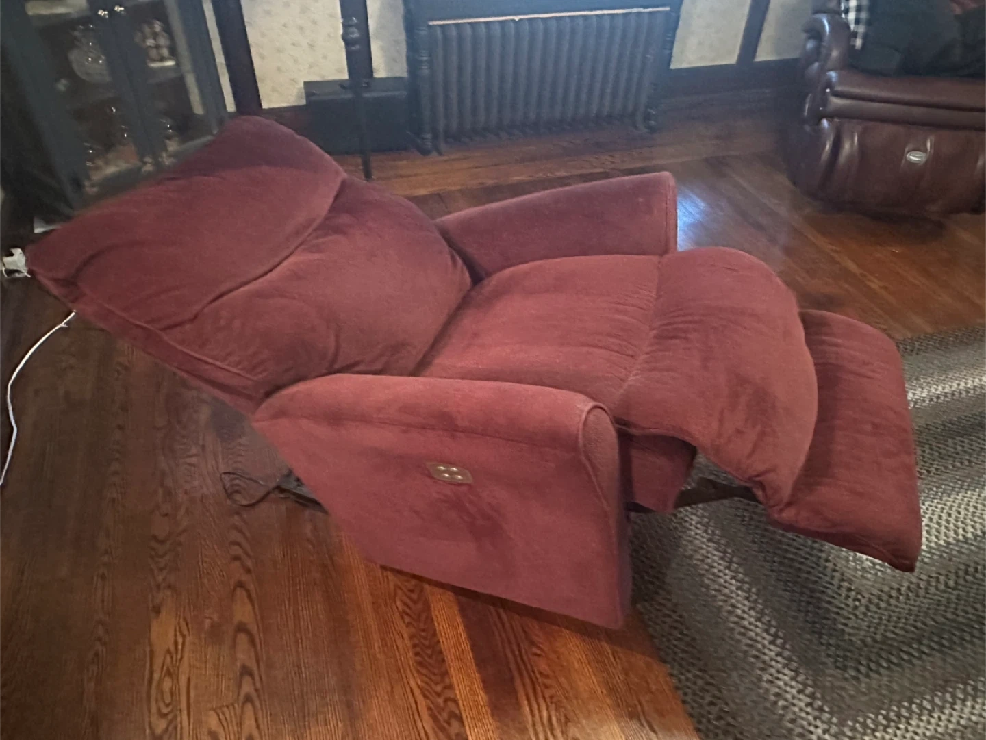Comfortable burgundy recliner chair. It's in good condition and ready to be used in your home. It has a manual reclining mechanism.