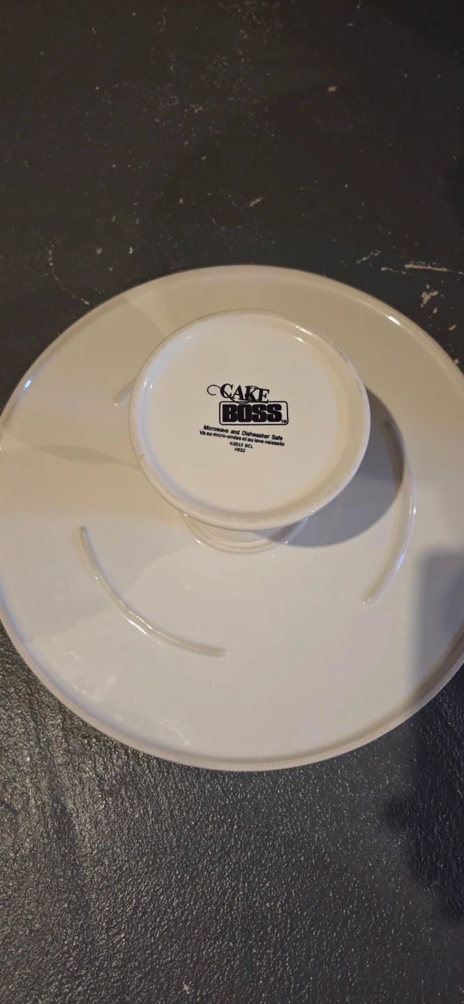Selling a Cake Boss cake stand in white. It's microwave and dishwasher safe, making it super convenient for everyday use and cleanup! Perfect for displaying your delicious creations