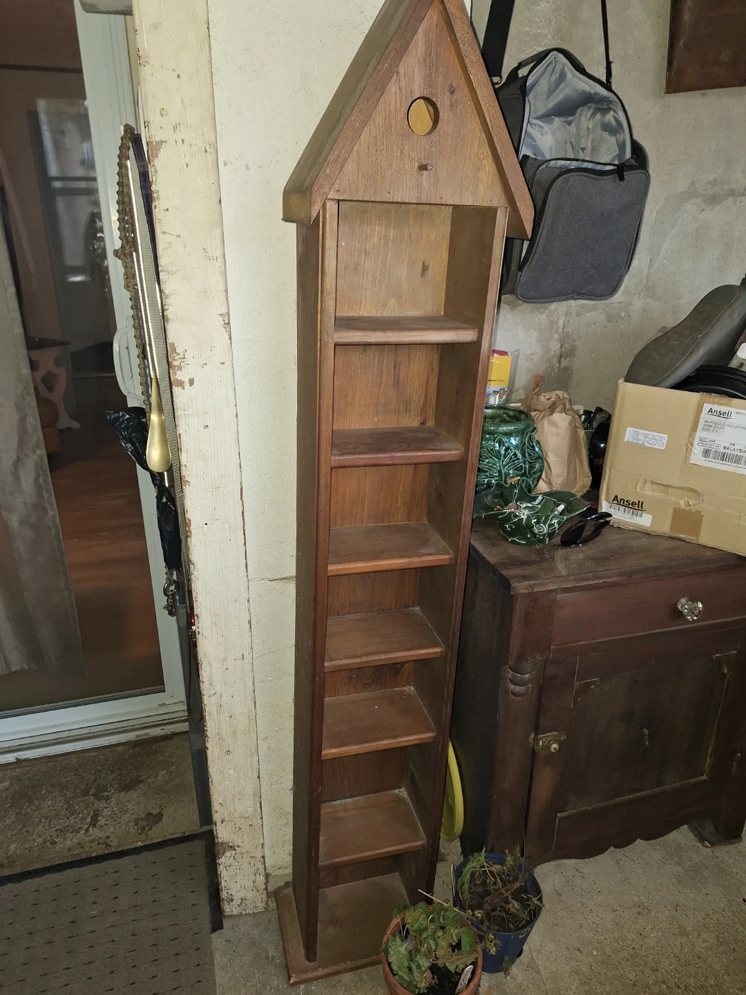 Selling a unique wooden shelf shaped like a birdhouse! It has several shelves and would be perfect for displaying small items or plants. It's in good condition and ready for a new home! Was a c.d. holder but i used it to hold rolls of toilet paper and perfume bottles