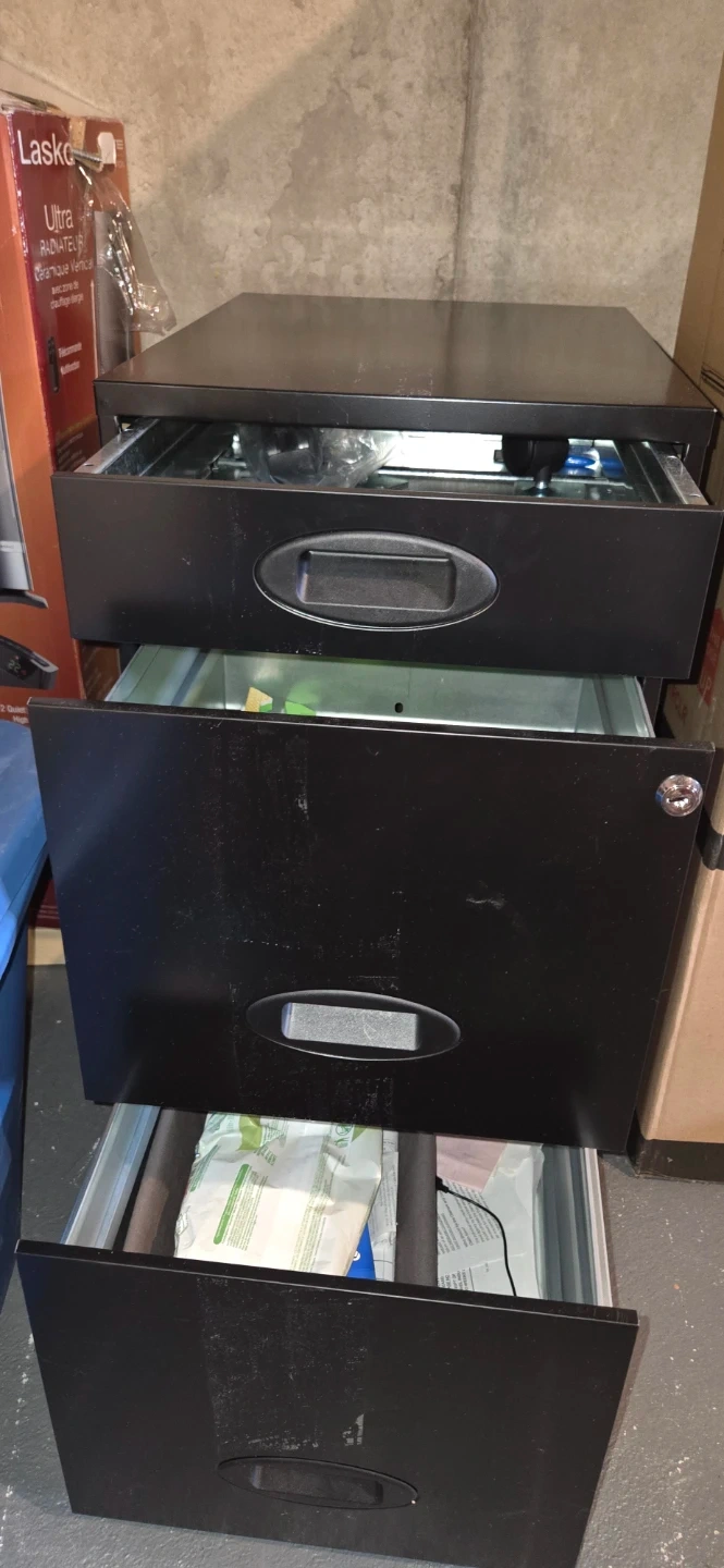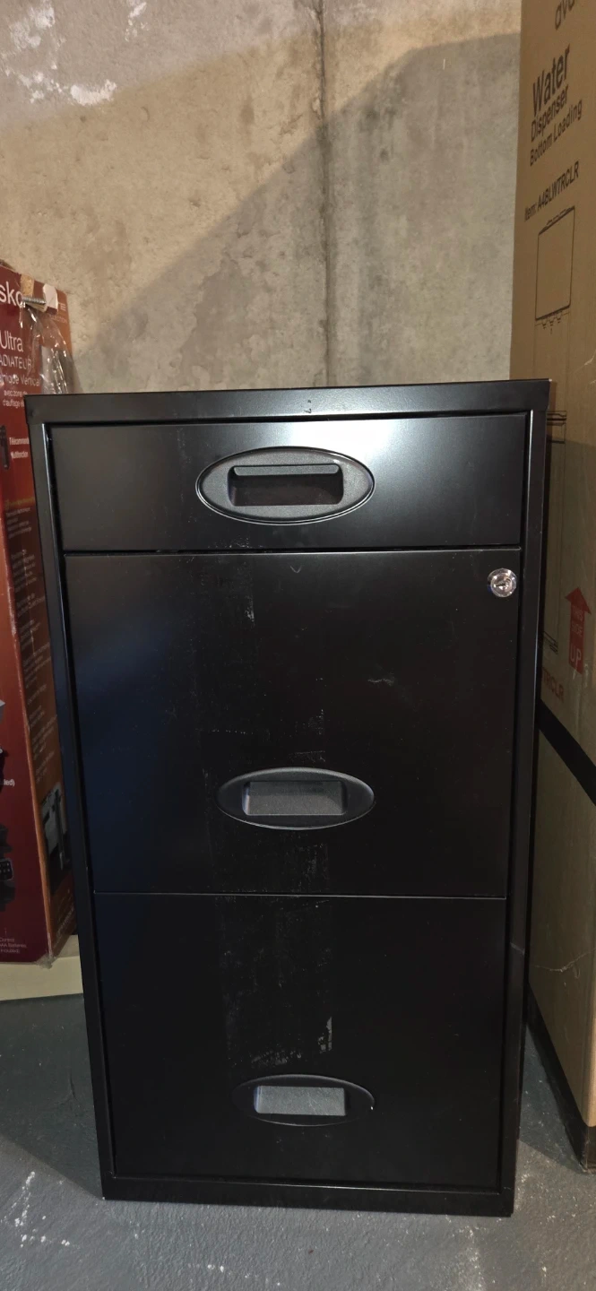 Here's a sturdy black filing cabinet with three drawers! It's perfect for keeping your documents organized at home or in the office. It has some signs of use, but it's still fully functional and ready to help you stay organized