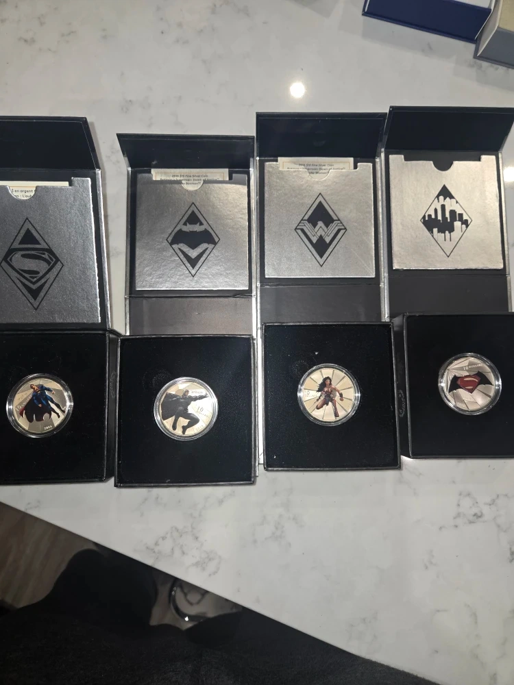 Selling a set of DC Comics 2016 Fine Silver Coins. Each coin features a different DC character: Superman, Batman, Wonder Woman, and one with the city skyline. They are in their original boxes.