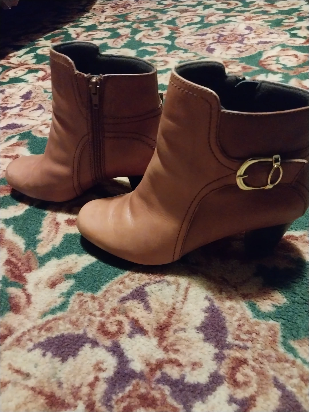 Selling a pair of gently used brown leather ankle boots. They are size 8 and have a stylish buckle detail on the side. Perfect for fall or winter!