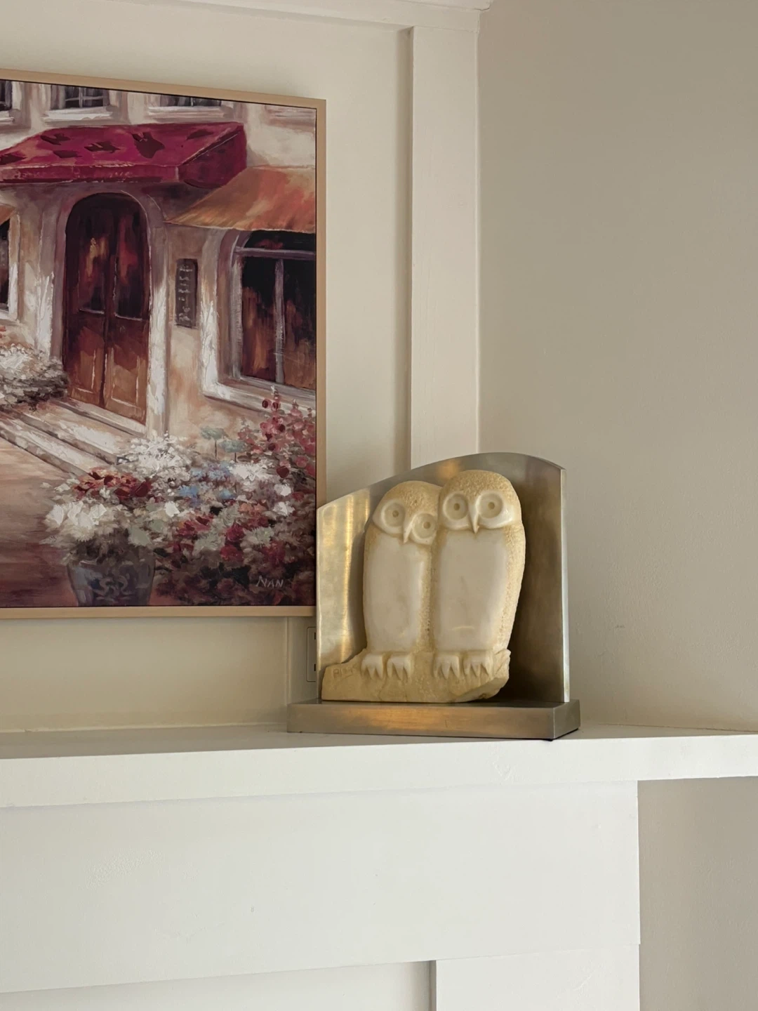 A charming owl sculpture that would look great in any room! It features two owls perched together on a branch, set against a sleek metal backdrop. The sculpture has a lovely texture and a neutral colour that will complement any decor. It's in great condition and ready to add a touch of whimsy to your home
