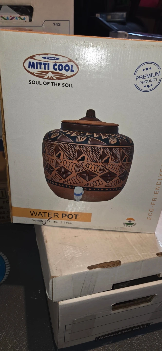 Selling a Mitti Cool water pot! It's eco-friendly and has a capacity of 11 to 12 litres. It's a premium product with a beautiful design, perfect for keeping your water cool naturally. The box is included!