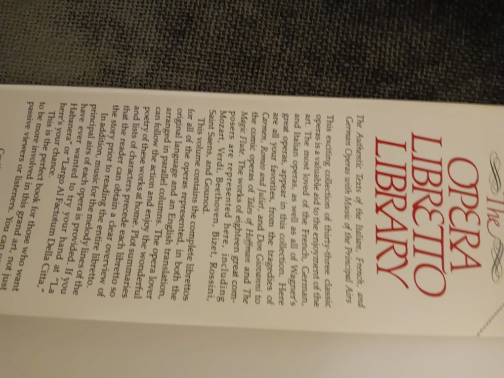 Selling The Opera Libretto Library. It features the authentic texts of the German, French, and Italian Operas with Music of the Principal Airs. Includes the complete English and German, French, or Italian parallel texts. This is a perfect book for those who want to be more involved in this grand art, not just passive viewers or listeners