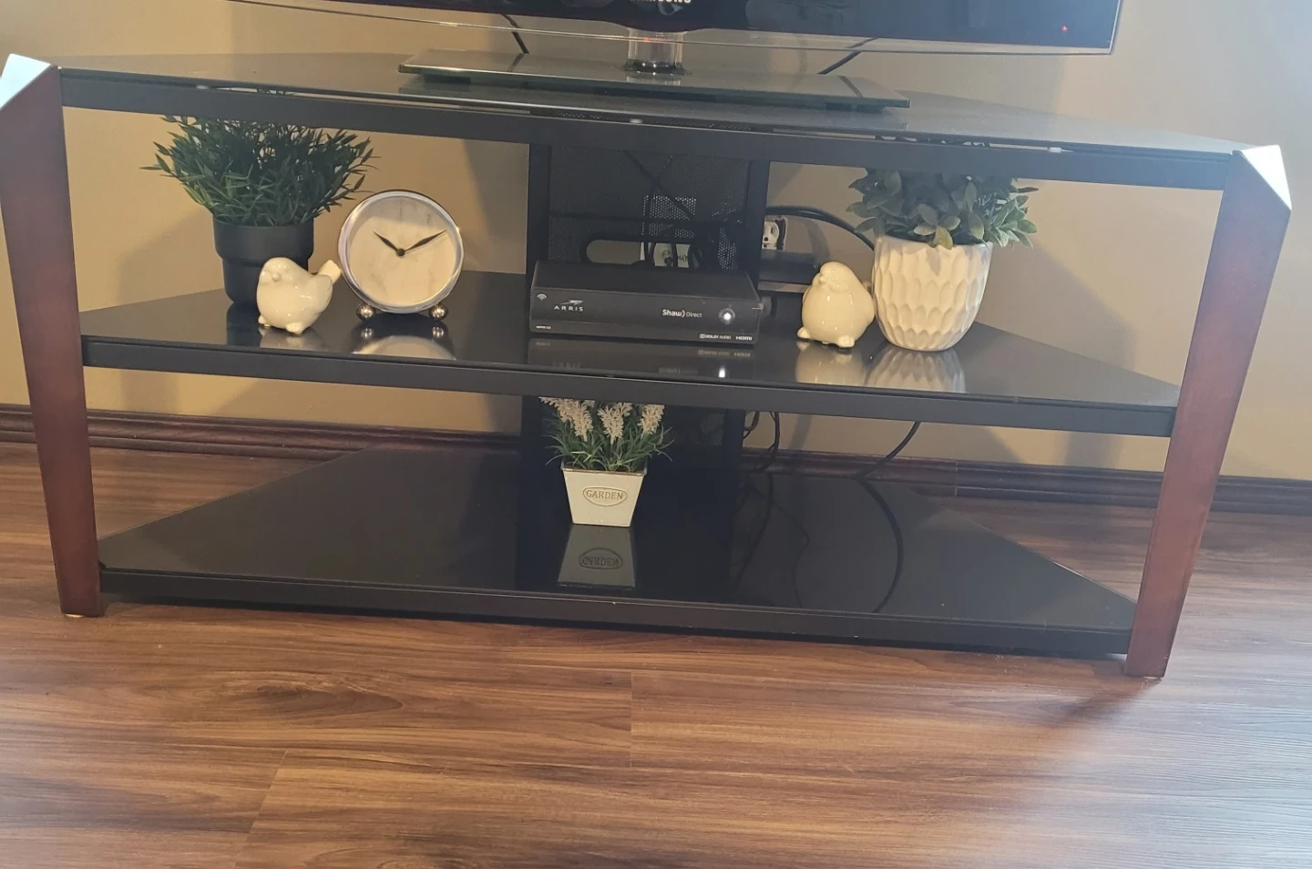 Stylish and sturdy TV stand in excellent condition. Features black tempered glass shelves with dark wood side supports. Lots of space for consoles, décor, and storage. Open-back design makes it easy to manage cables. Can br used in a corner or any area of room