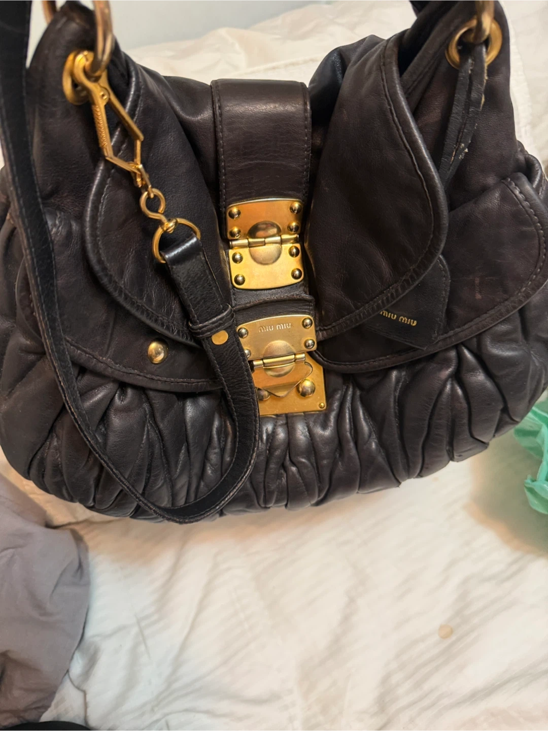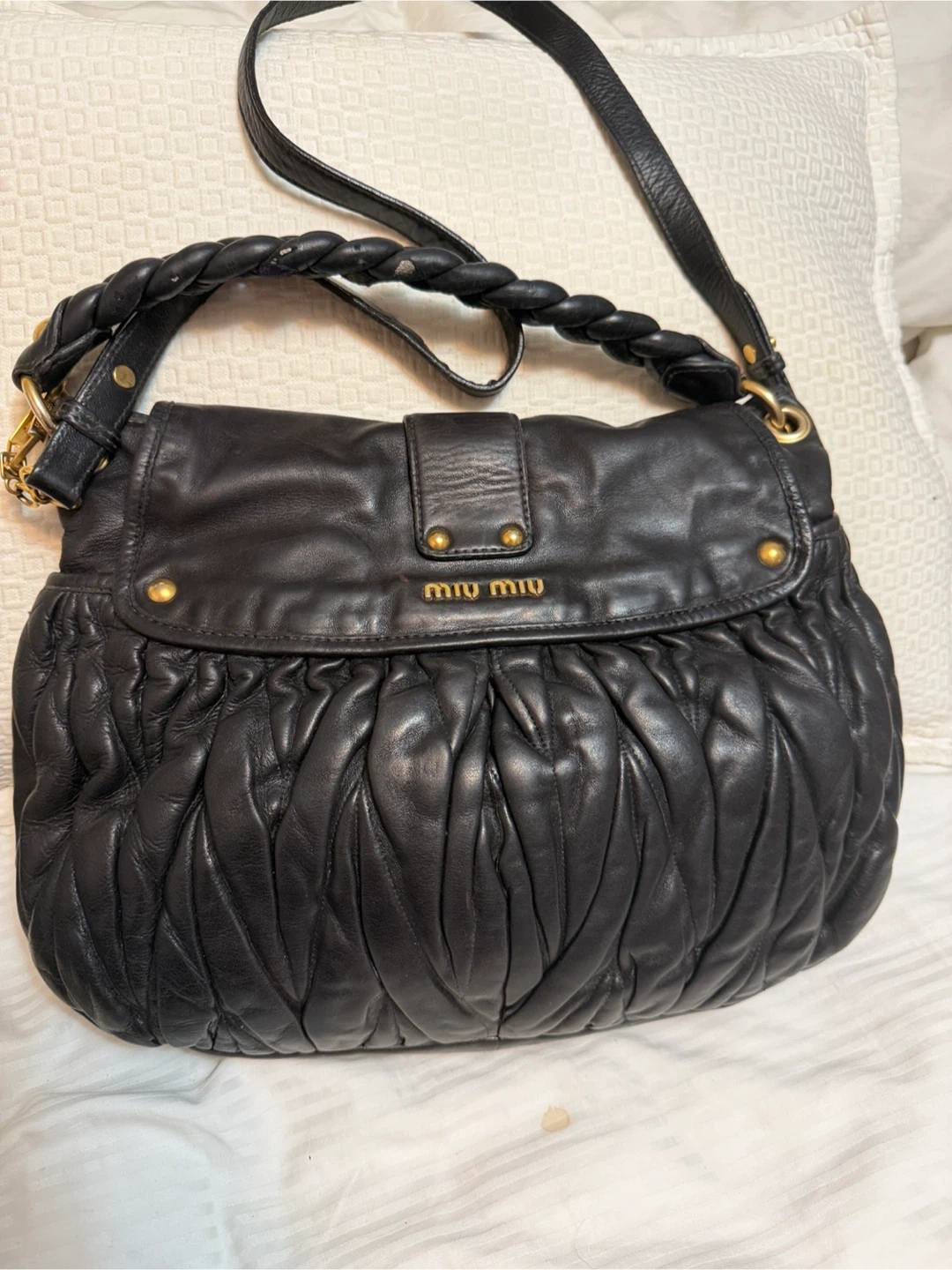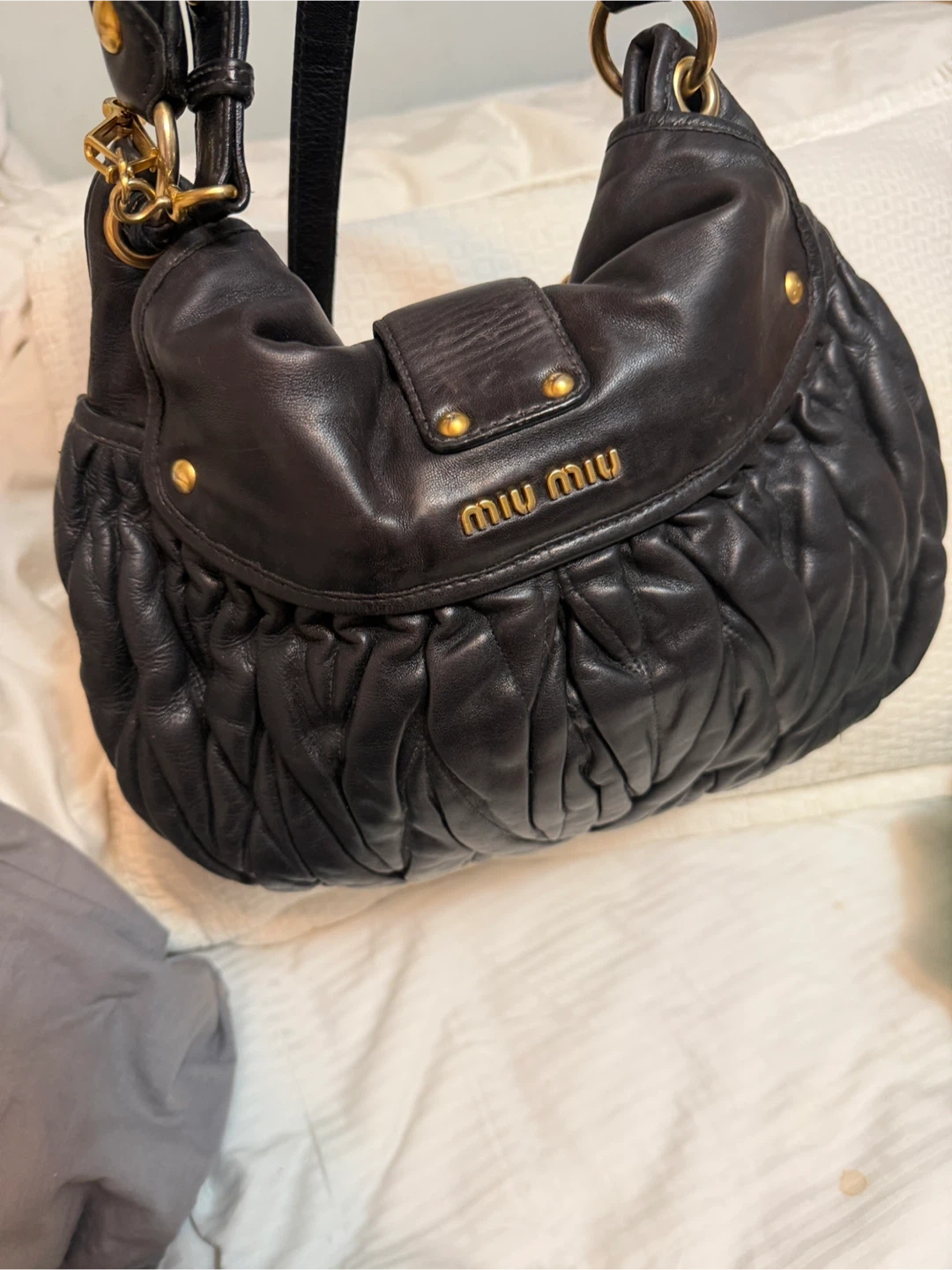 Buy & SellMiu Miu Black Leather Shoulder BagMiu Miu Black Leather Shoulder Bag$302Selling a Miu Miu black leather shoulder bag. It features gold-tone hardware and a distinctive ruched design. Comes with its original dust bag.BrandMiu MiuWHERE TO MEETCheck LocationView MapSELLERverifiedThessEast Vancouver882 reviews7 chats·5 favorites·294 viewsSEND CHAT TO SELLERHi Thess! I’m interested in your listing.Hi Thess! I’m interested in your listing.Get the Karrot app to chatSign In to chat