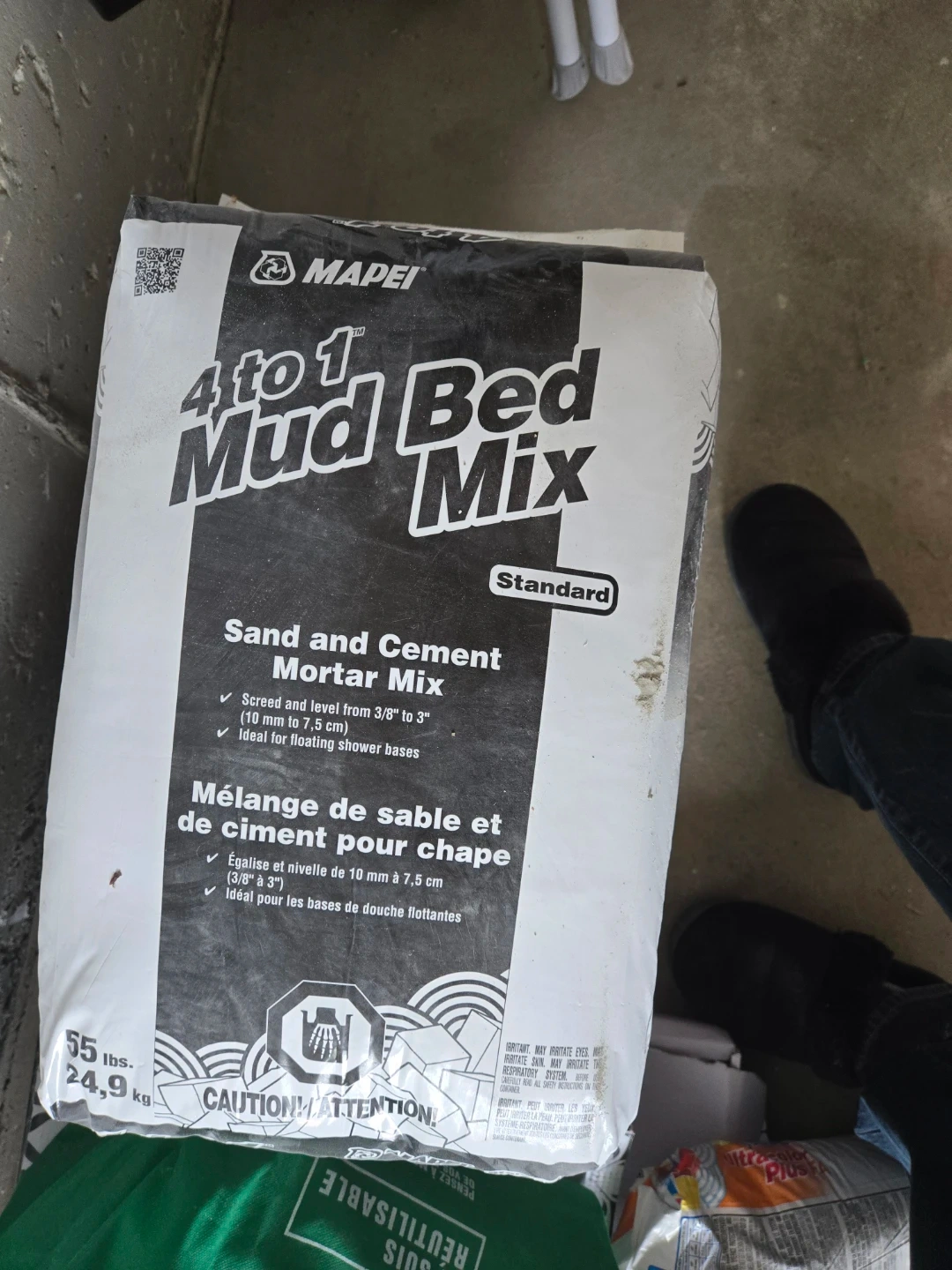 Selling a bag of MAPEI 4 to 1 Mud Bed Mix. It's a standard sand and cement mortar mix, ideal for creating floating shower bases. This 55 lbs bag helps screed and level from 3/8" to 3" (10 mm to 7,5 cm).
