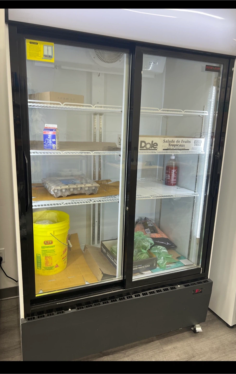 Selling a commercial refrigerator, perfect for storing drinks and food items. It features sliding glass doors and multiple shelves for organization