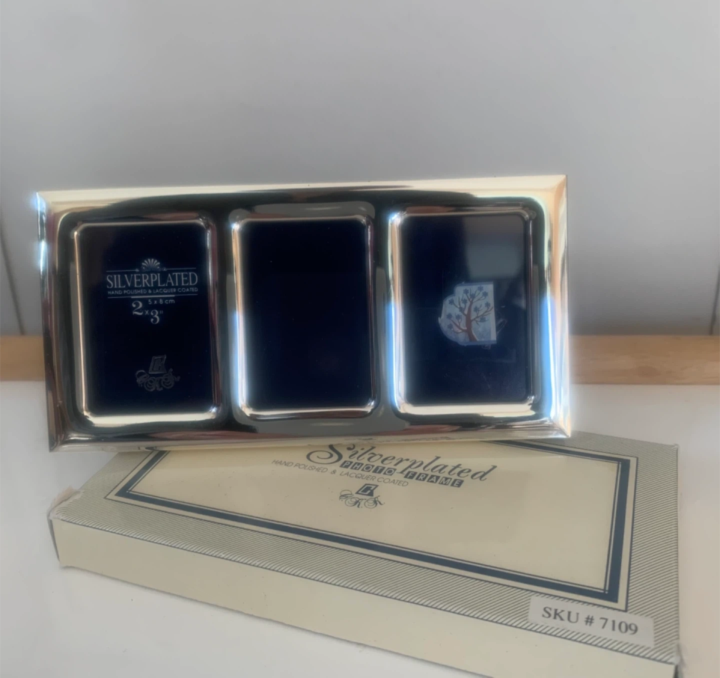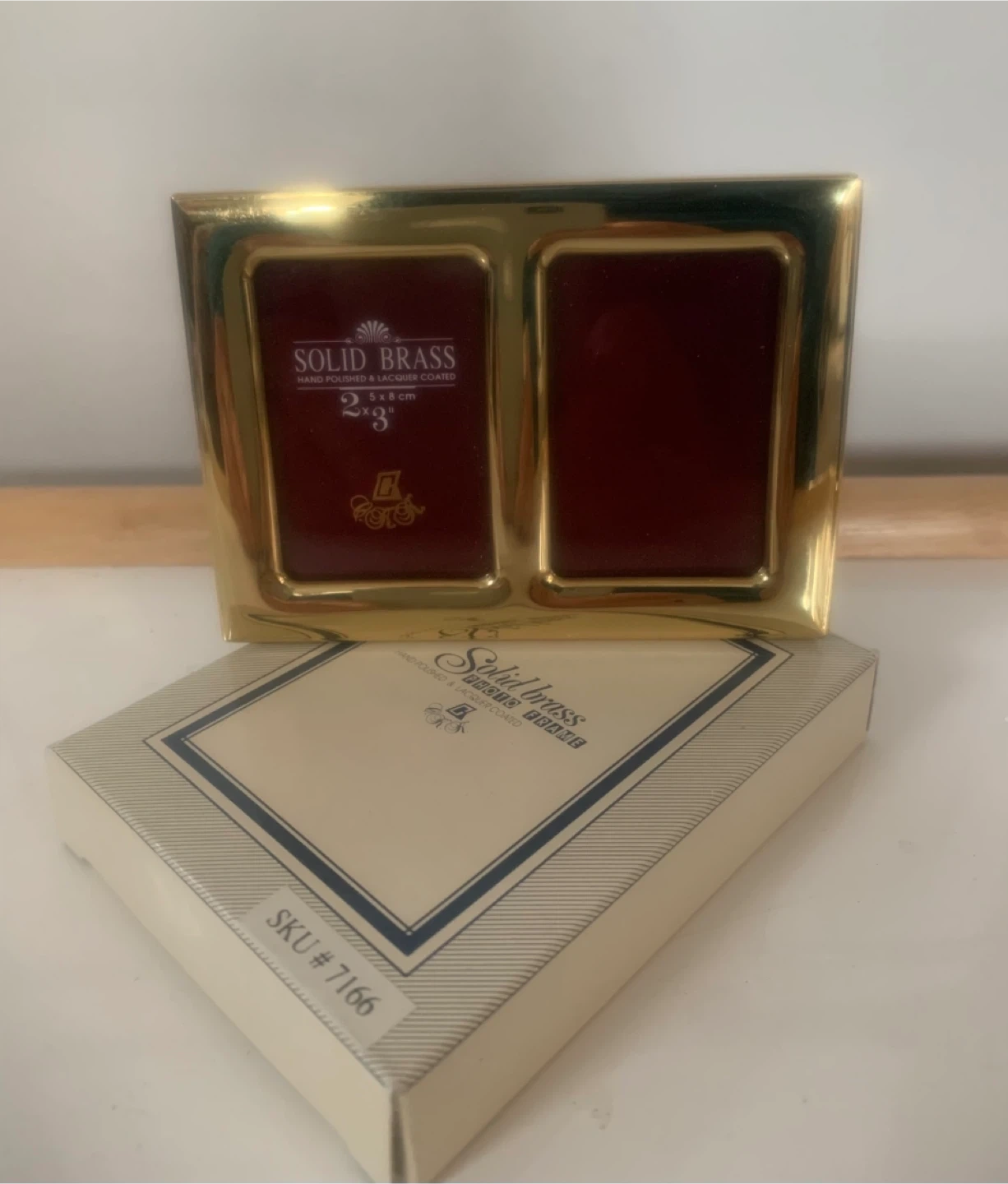 - A solid brass frame, hand polished and lacquer coated, holding two 2" x 3" photos