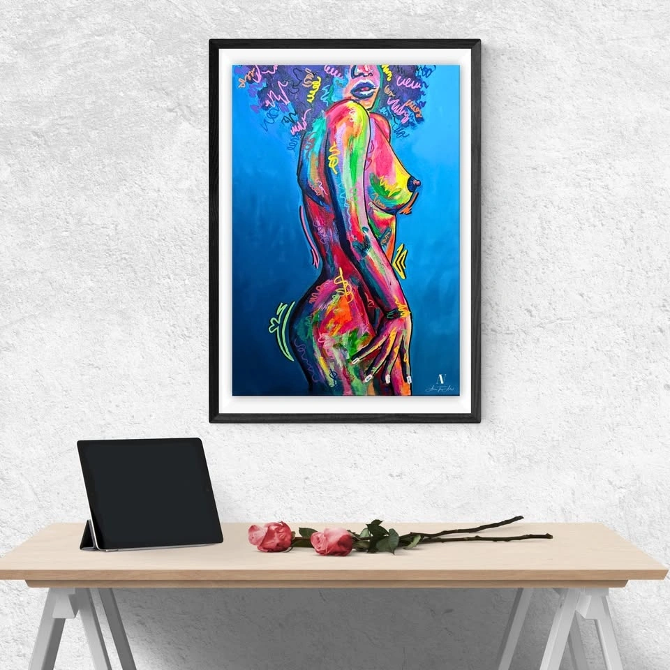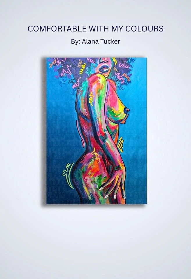 "Comfortable with My Colours" is a celebration of self-acceptance and confidence that transcends skin tone, imperfections, and societal standards. The painting features a nude woman in side profile, her curly hair and soft yet vibrant neon and pastel hues capturing the essence of beauty beyond traditional boundaries. With her chin nestled against her shoulder, she looks toward the viewer with a quiet but unmistakable confidence. Her eyes are unseen, but her presence radiates self-assurance.