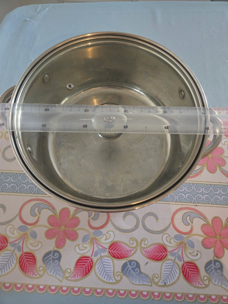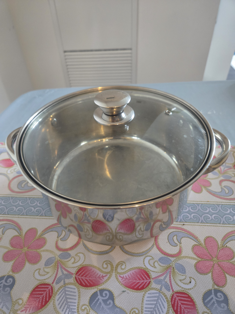 Stainless steel stock pot with a glass lid. It's in great condition and ready for your next culinary adventure! The pot is 26cm in diameter. 5qt