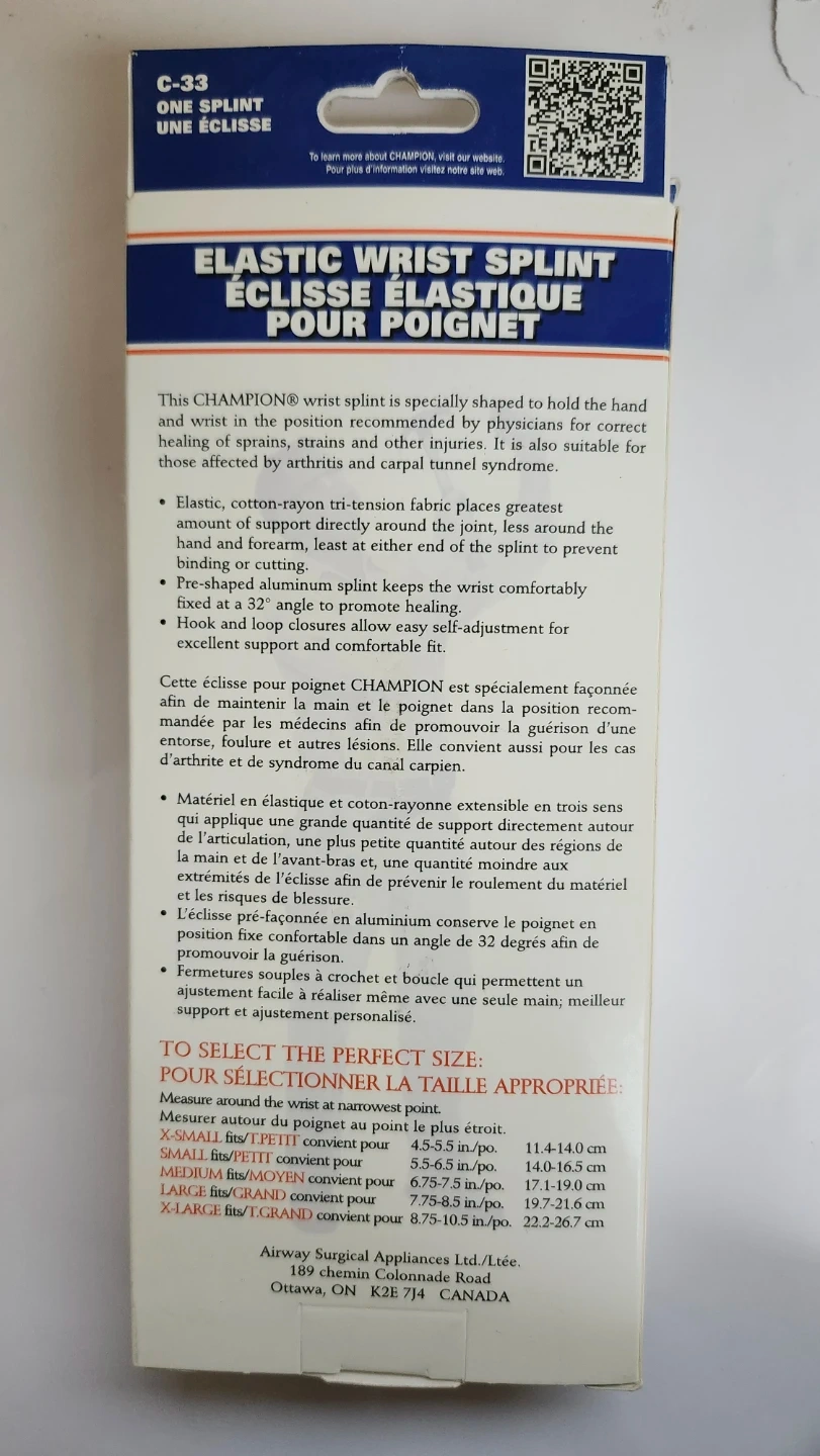 Brand New Champion Elastic Wrist Splint in size XL for the left hand. This wrist splint is designed to hold the hand and wrist in the position recommended by physicians for healing of strains and other injuries. It's also suitable for those affected by arthritis and carpal tunnel syndrome. Originally bought for $19.99