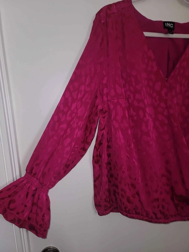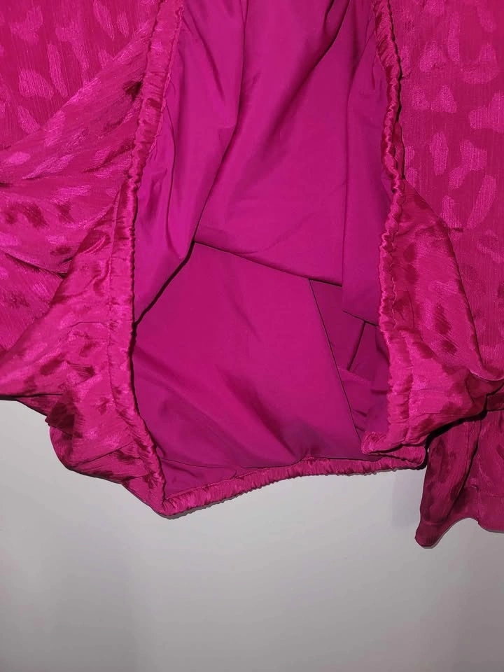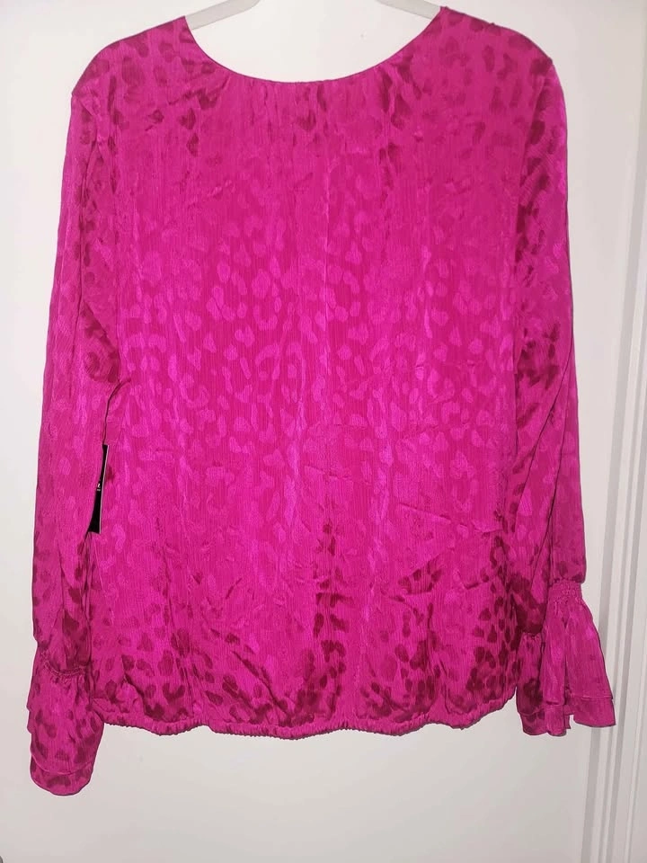 This is new with tags still on. Such a vibrant fun top, jewel tone fuschia pink. Satin feel. Subtle Animal print. Surplice neckline with button in middle chest. Elastic waist. Elastic wrist cuff with flare cuff. Size 2x. Pick up in Scarborough, Kennedy & 401. Occasionally downtown Toronto, Queen & Victoria. Meet at local mall if schedule permits, to quickest meetup