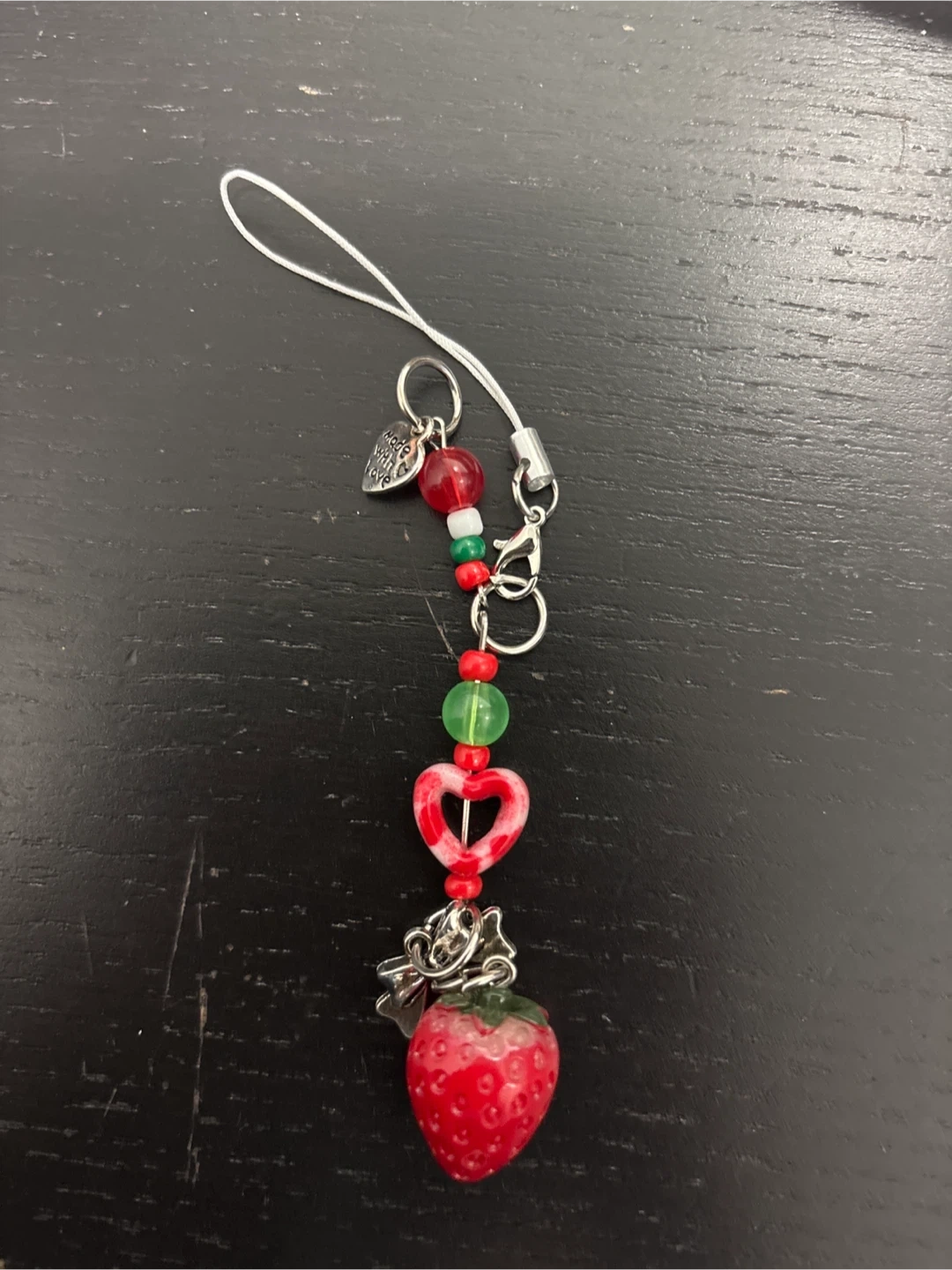 Here's a cute beaded phone charm! It features a strawberry, a heart, and other colourful beads. It would look great on your phone!