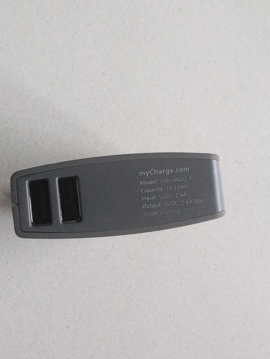 Selling a myCharge portable charger, model AMU44GG-A. It has a capacity of 16.28Wh, with an input of 5VDC, 2.4A, and an output of 5VDC, 2.4A Max.