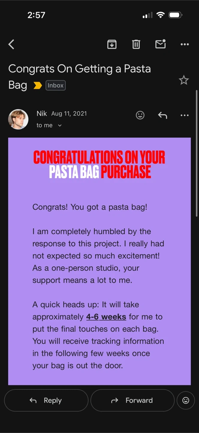 Selling "The Pasta Bag" by Nikolas Bentel. It's edition #001! Comes with the original box. This unique bag is sure to turn heads!