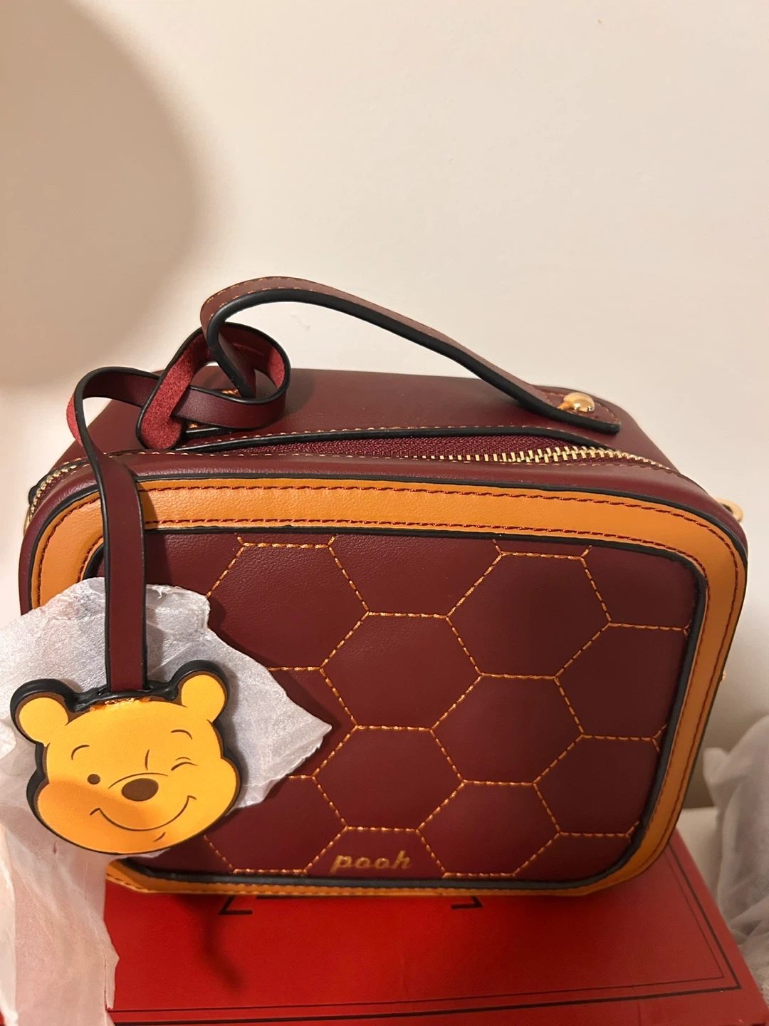 Here's a super cute Disney Winnie the Pooh crossbody bag! It's a beautiful burgundy colour with gold hardware and a detachable Pooh charm. Comes with its original box!