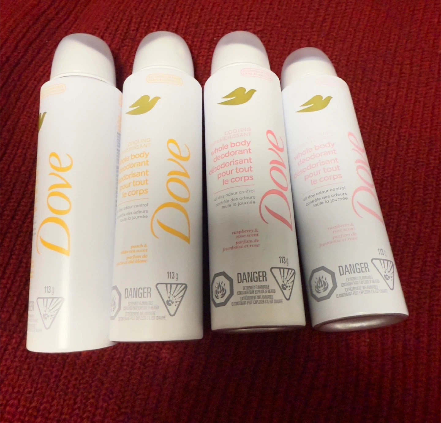 Selling a set of Dove Whole Body Deodorant cans! There are four cans in total, each containing 113 g. Two are peach & white nectarine scent and two are raspberry & rose scent. Perfect for everyday use