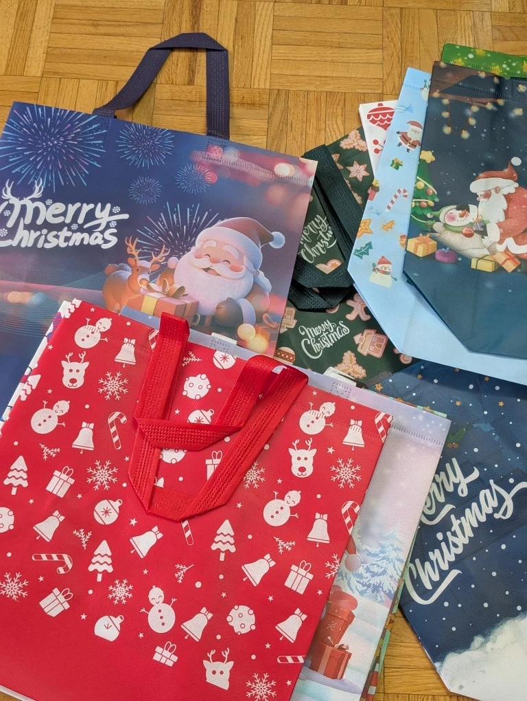 A collection of reusable shopping bags with festive Christmas designs. Great for groceries or gifts!