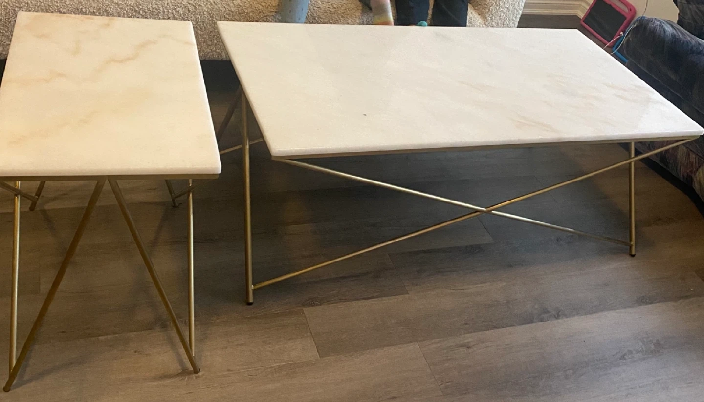 Selling a beautiful marble top coffee table set. The set includes a larger coffee table and a smaller side table, both featuring a faux-marble top and a stylish gold finish on the legs. Perfect for adding a touch of elegance to your living room!